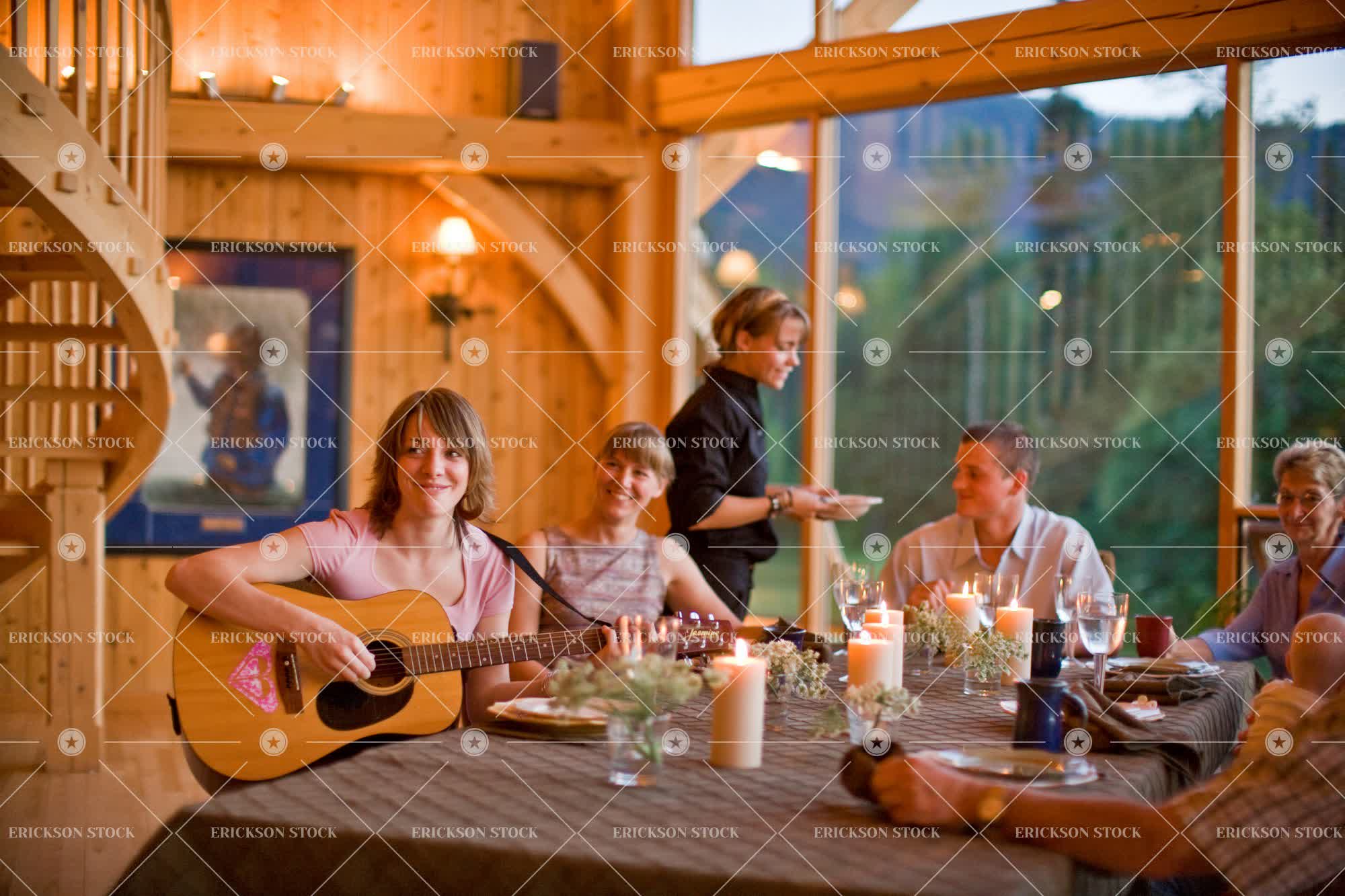 Tags acoustic guitar, adult, baby, boy, candle, candlelight, cropped, day, dining room, dining table, dinner, dinner party, dish, eateries, eatery, elderly, family, family dinner, family dinners, female, Food, Food and drink, forest, forests, friend, friends, friendship, group, Guitar, guitar player, guitar players, Guitarist, guitarists, guitars, half length, happiness, happy, head, head & shoulders, head and shoulders, head shot, headshot, hobbies, hobby, home, home interior, home interiors, homes, horizontal, house, house interior, house interiors, houses, indoor, indoors, infant, infants, inside, instrument, instruments, interior, interiors, leisure, leisure activities, leisure activity, male, mature adult, meal, meals, medium group of people, mid adult, multi generational family, multi-generational families, Music, Musical instrument, musical instruments, Musician, musicians, old, part of, parties, party, people, perform, performance, performer, performers, performing, person, Playing, playing guitar, recreation, recreational pursuit, recreational pursuits, Restaurant, restaurants, scenery, scenic, scenics, selective focus, senior adult, shoulders, smile, smiling, social gathering, socializing, table, Tables, teenage boy, teenager, together, togetherness, Tree, trees, view, views, waist up, waitress, waitresses, window, windows, woman, wood, woods, young adult