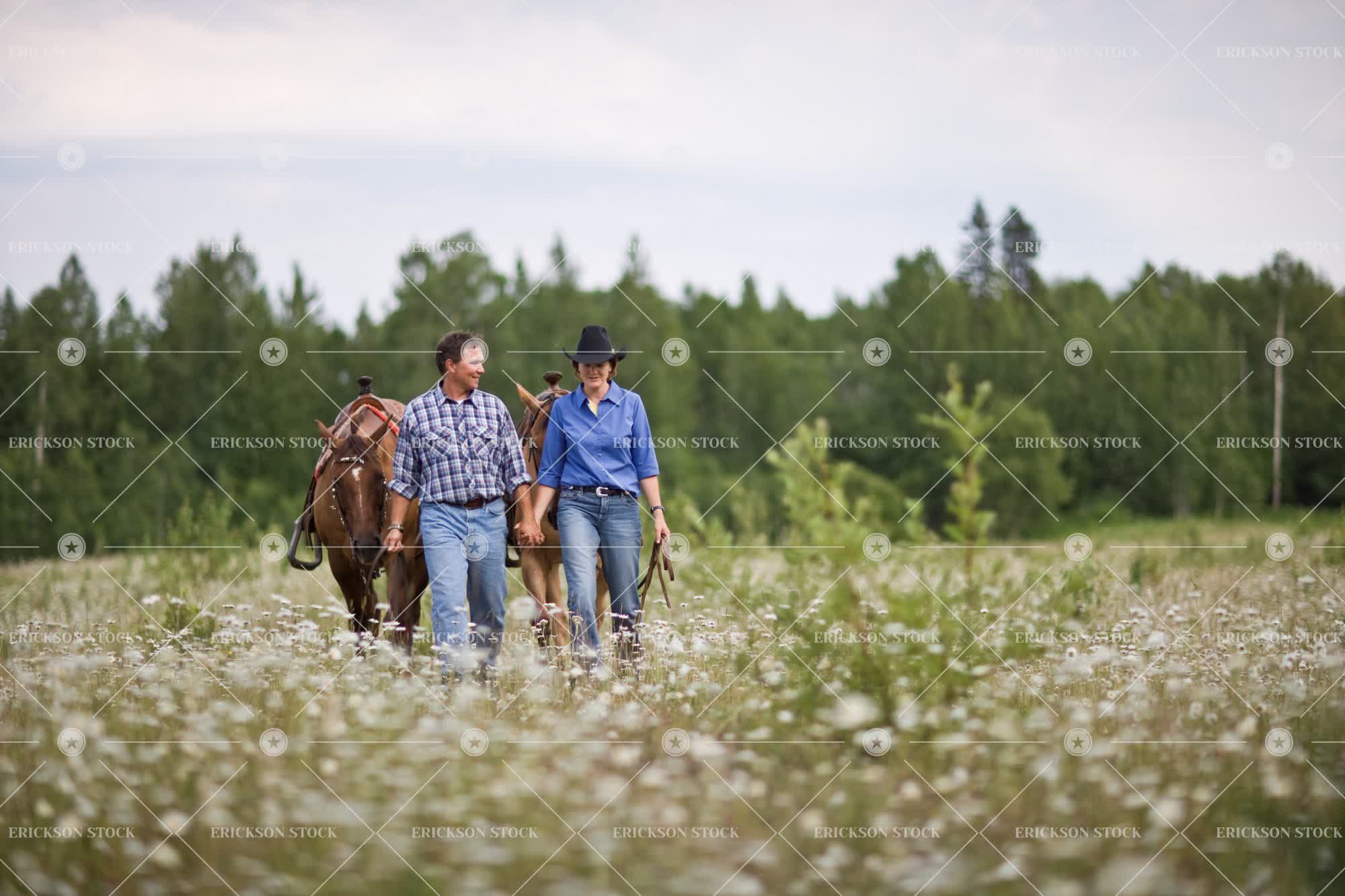 Mature couple leading horses through a meadow