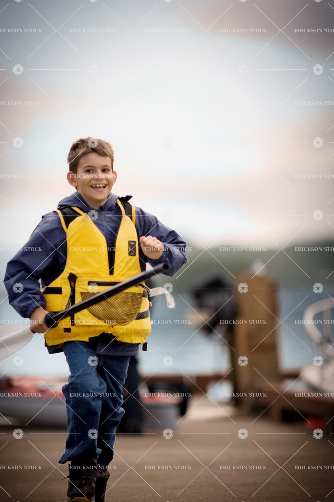 Smiling young boy running wearing a life jacket and carrying an oar.