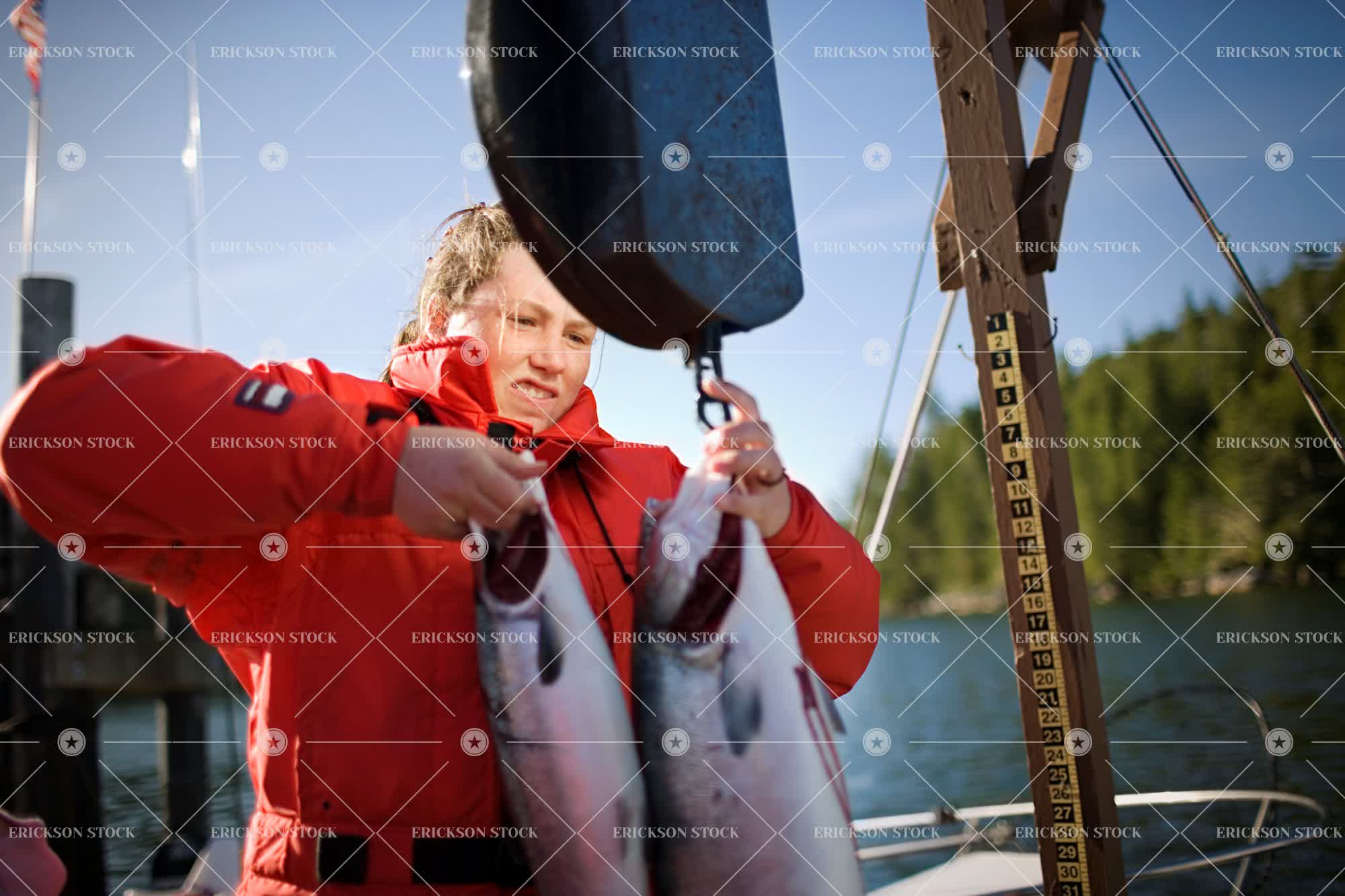 Teenage girl lifting two fish up to be weighed.