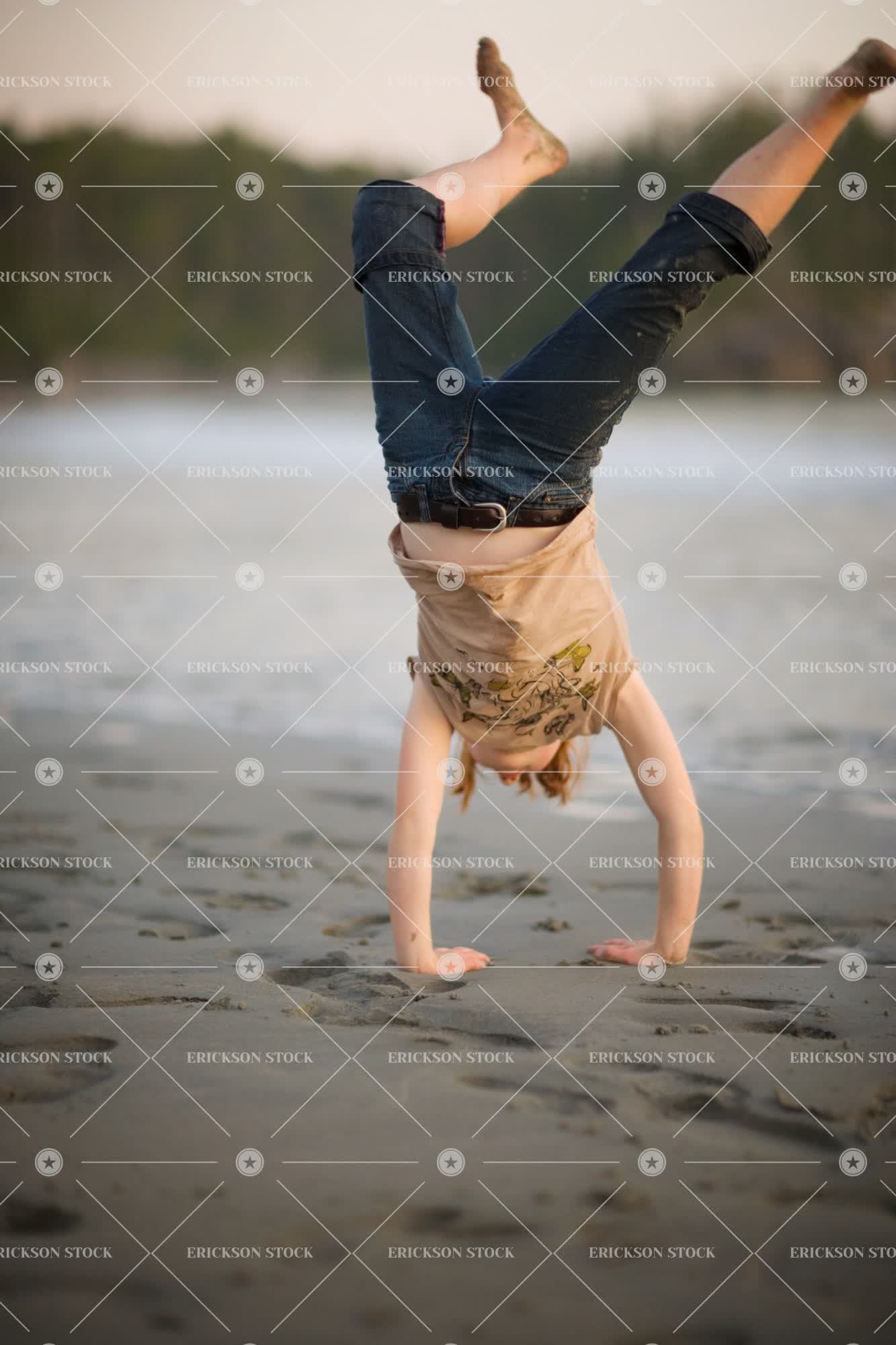 Young girl doing a handstand on the beach.