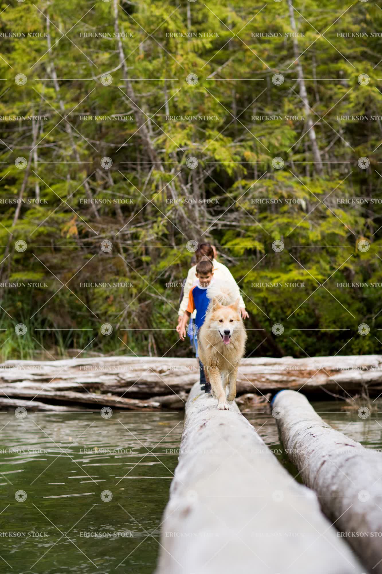 Dog followed by a family walking along a fallen log to cross water.