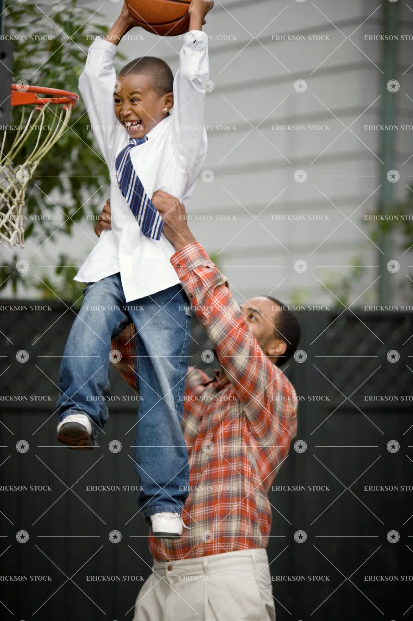 Tags african american, arm raised, ball, basketball, boy, child, day, domestic, dunk, elementary age, energy, excitement, father, fondness, full length, Fun, game, happy, helping, holding, leisure activity, Lifting, loving, male, man, mid adult, motion, mouth open, net, outdoors, people, Playing, recreation, Side view, smiling, son, Sports, standing, together, two people, vertical, waist up, yelling