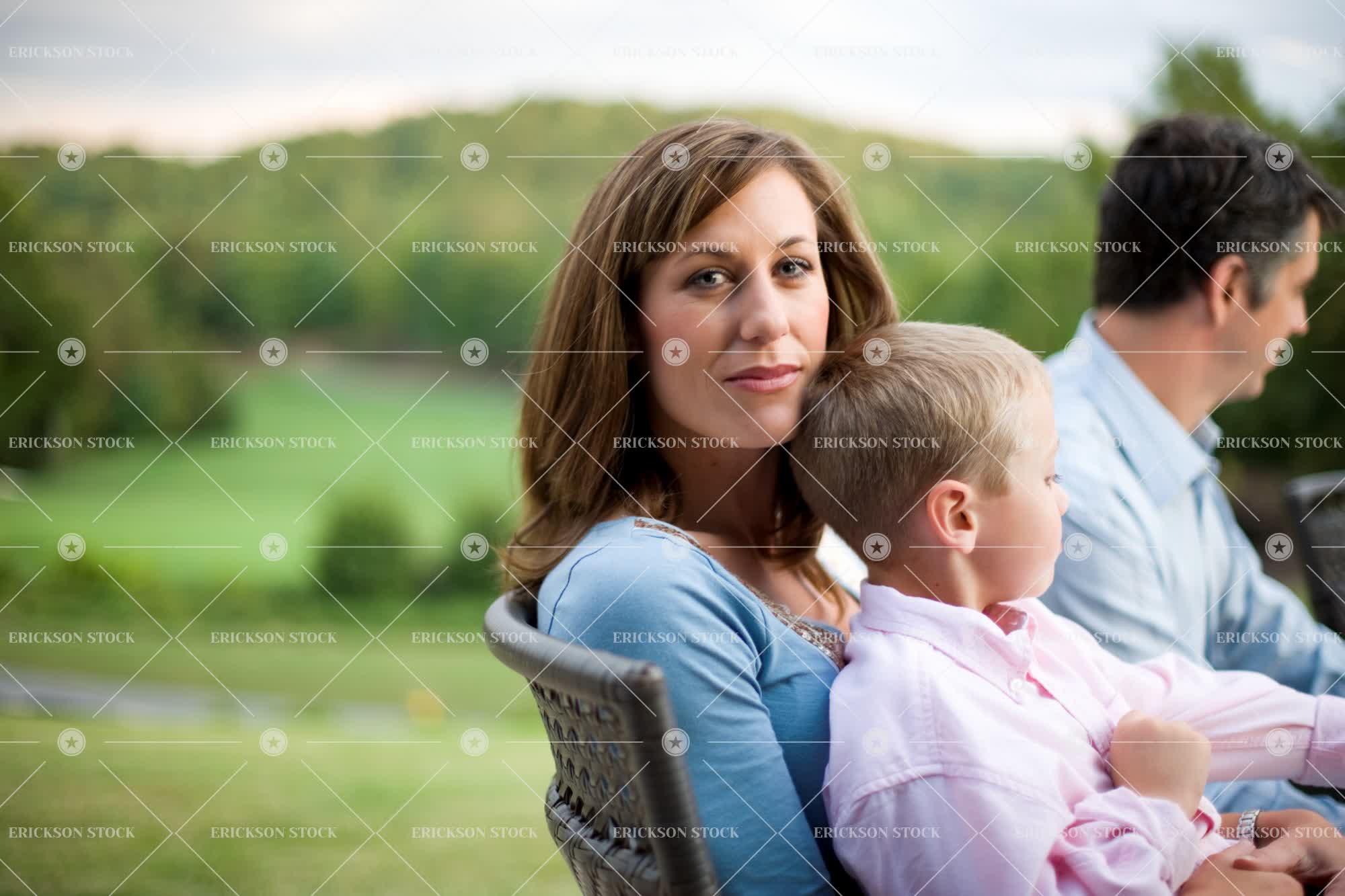 Portrait of a mid-adult woman sitting with her young son while outside with her husband.
