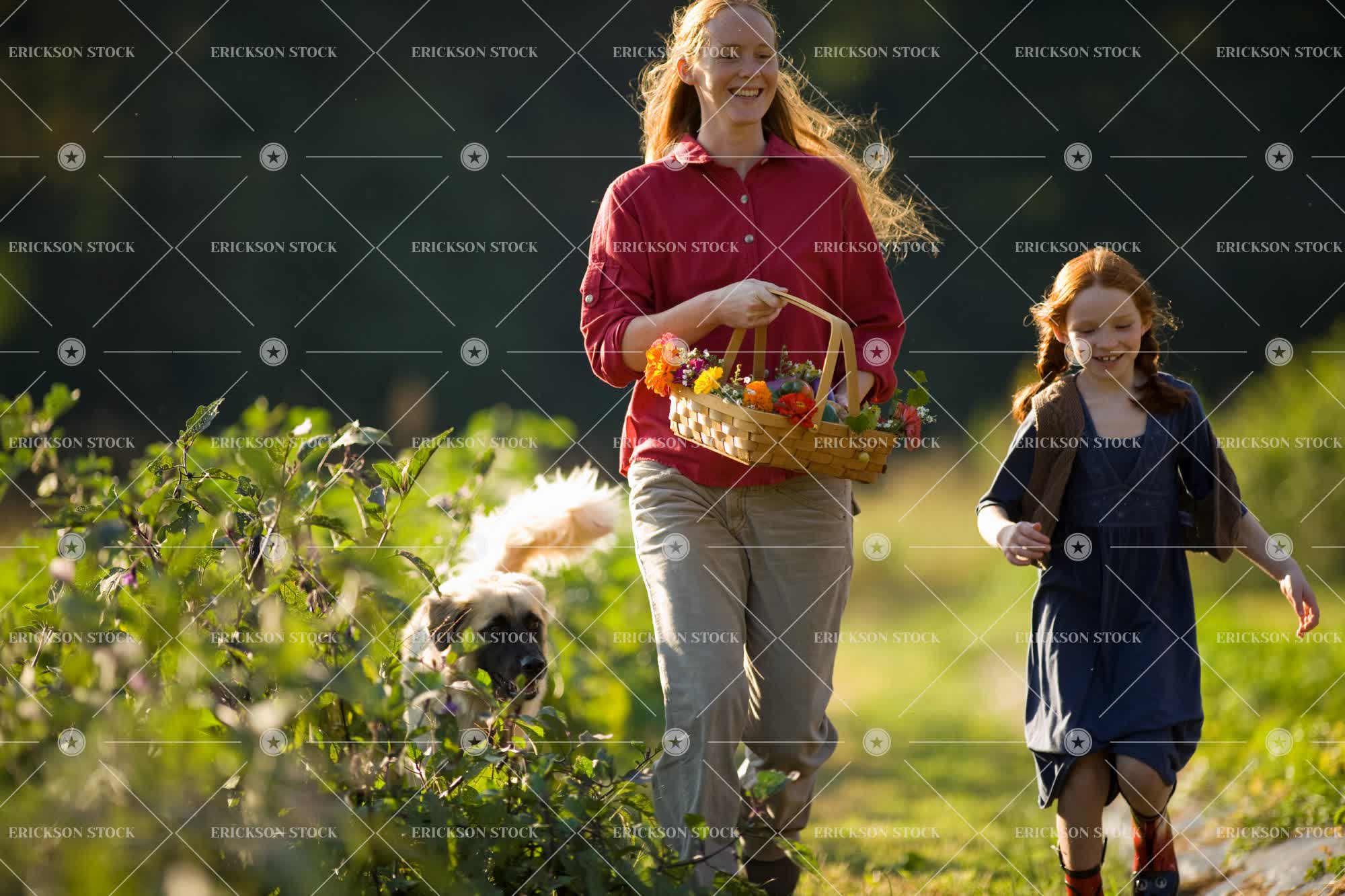 Mid-adult woman holding a basket of flowers running through a field with her young daughter and dog.