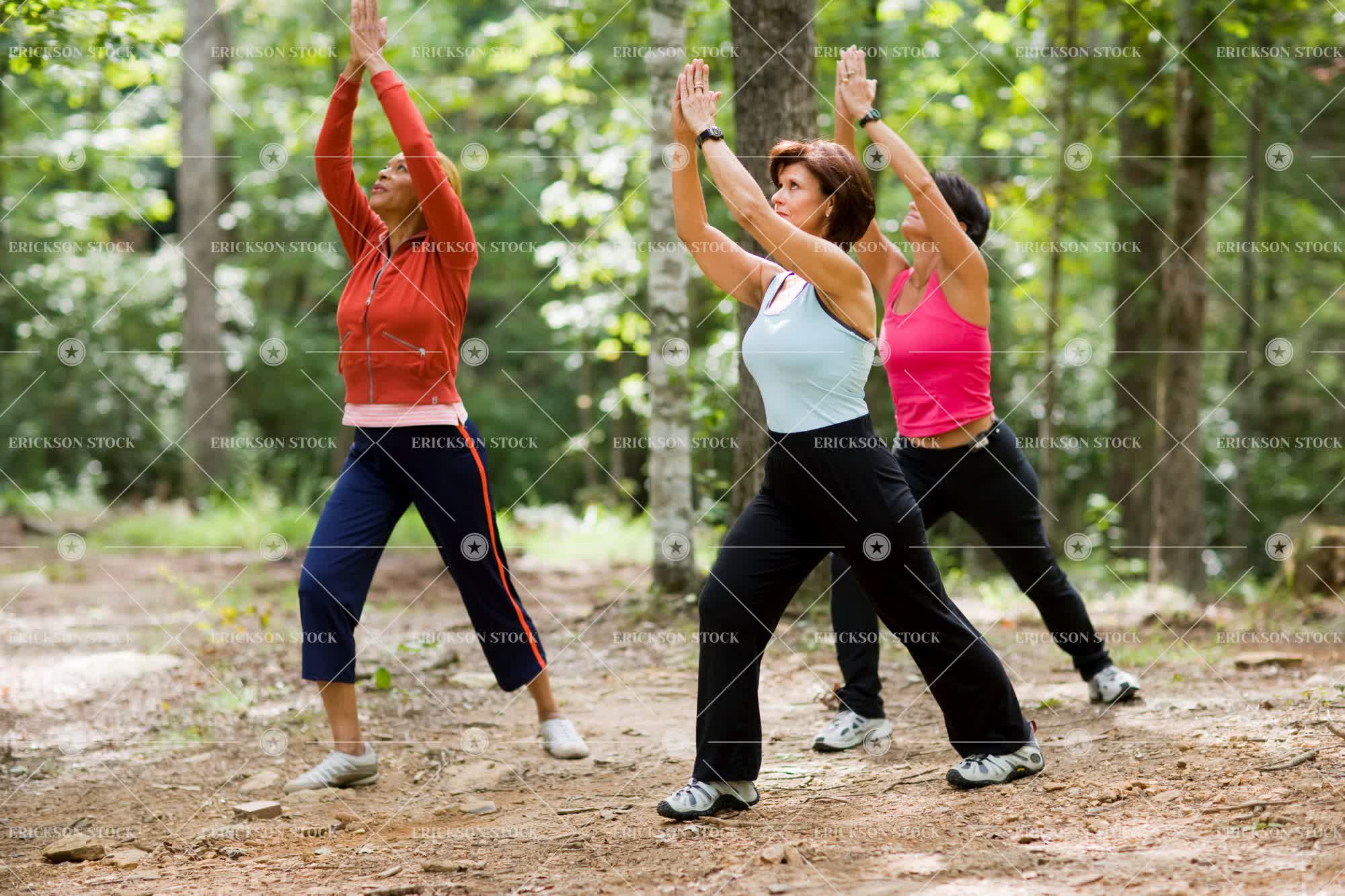 Middle aged women doing yoga in forest