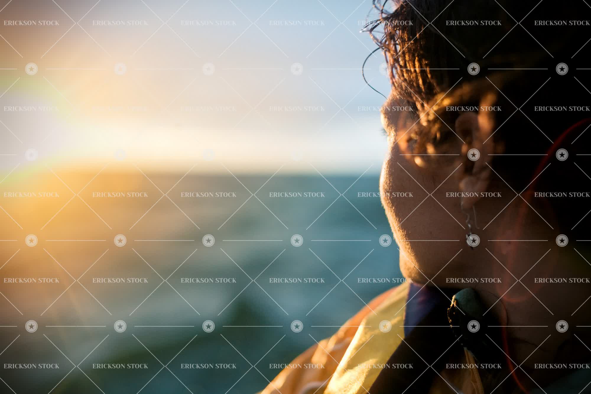 Mid-adult woman looking at the sun setting over the sea.