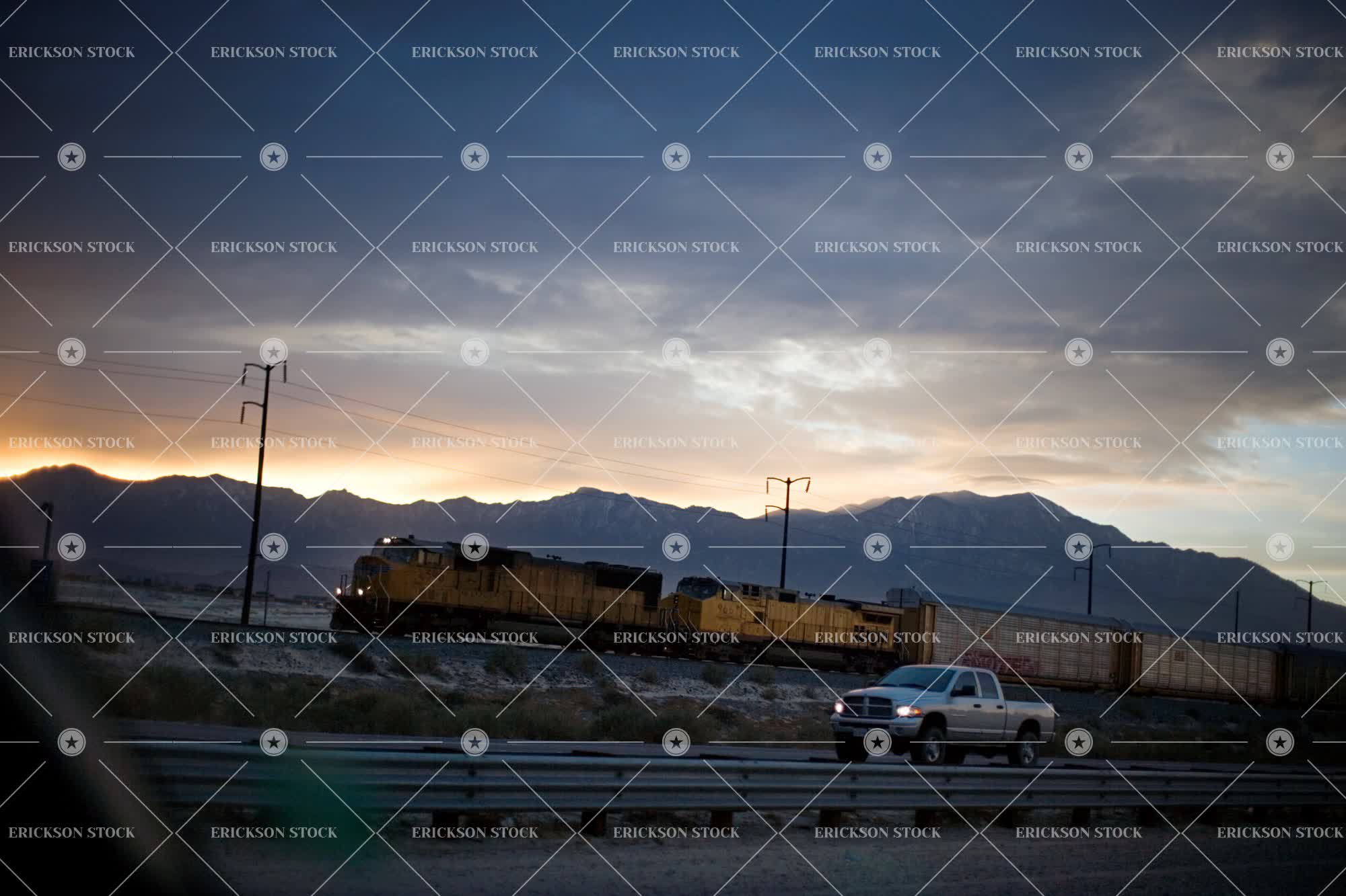 Tags cargo, copy space, drive, hauling, highway, horizontal, journey, low angle view, motion, mountain, mountain range, nobody, outdoors, Sunrise, sunset, train, Transportation, travel, truck