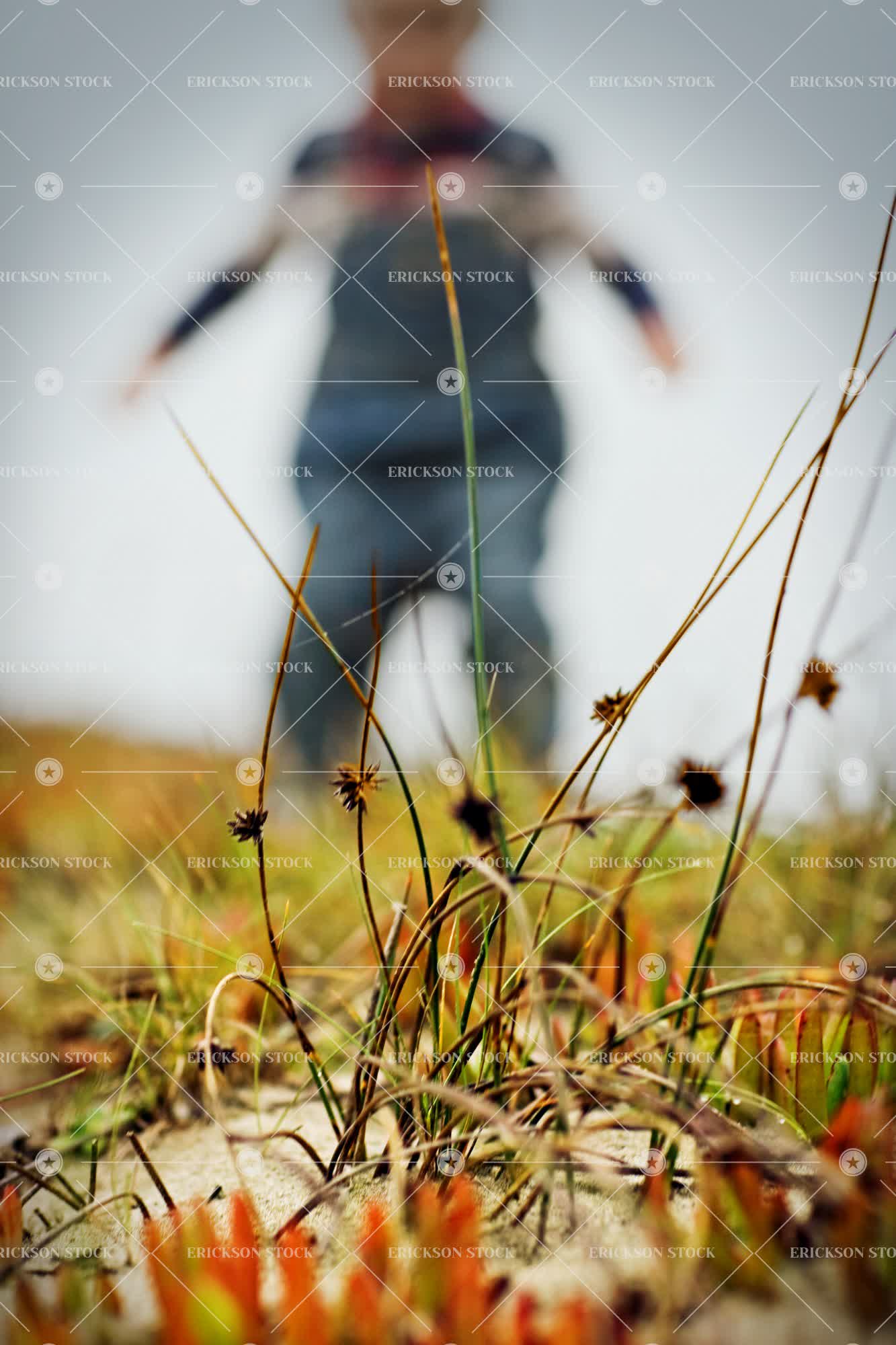 Close-up of sand dune grass with toddler in the background