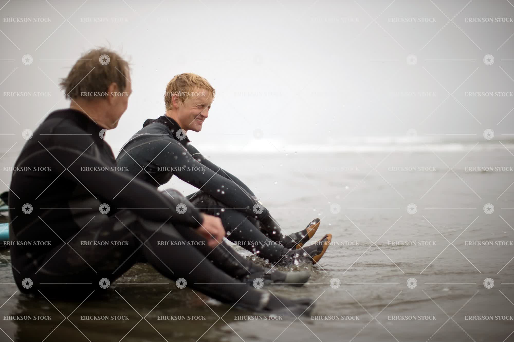 Mature man and his teenage son sitting in shallow water while wearing wetsuits at the beach.