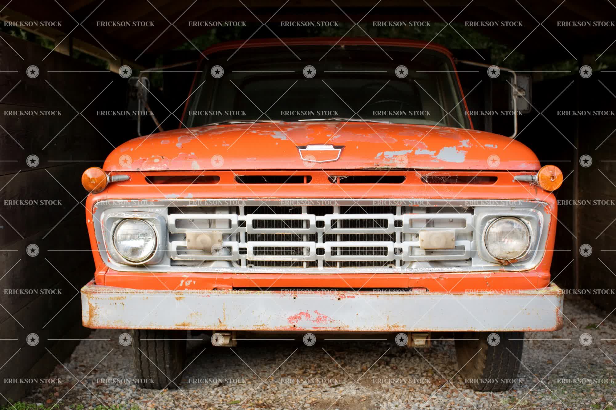 Orange pickup truck inside a shed.