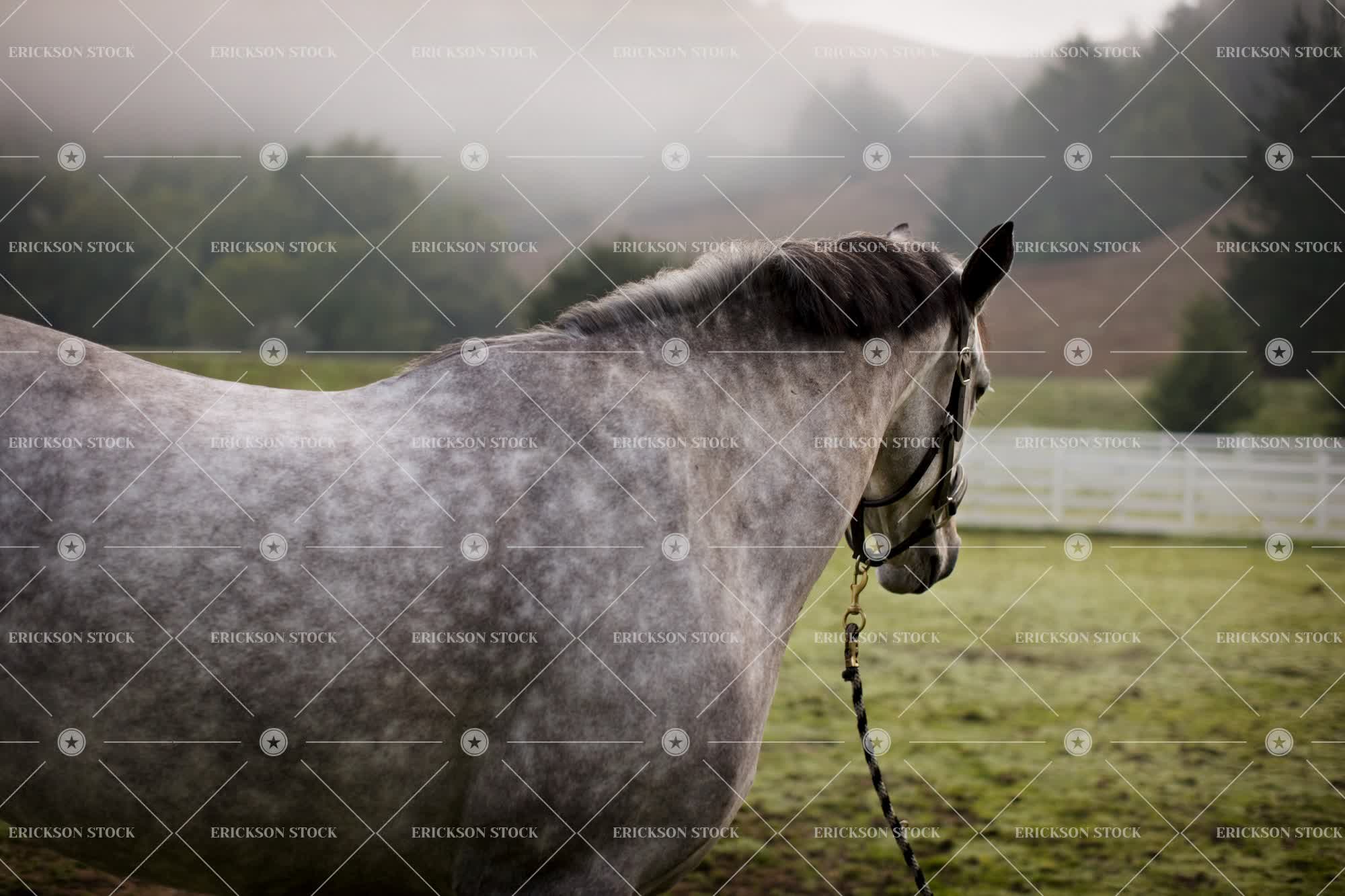 Tags animal, corral, countryside, dapple gray, day, field, fields, fog, foggy, fogs, haze, herbivore, herbivores, herbivorous, hoof, hooves, horizontal, horizontally, horizontals, horse, horse halter, horses, Mammal, mammals, Meadow, meadows, mist, misted, mistiness, misting, mists, misty, murkiness, murky, nature, nobody, one animal, outdoor, outdoors, outside, pasture, pastures, rural, rural scene, rural scenes, Side view, side views, standing, stood, vapor, vapors, vapour, vapours, vertebrate, vertebrates, warm-blooded