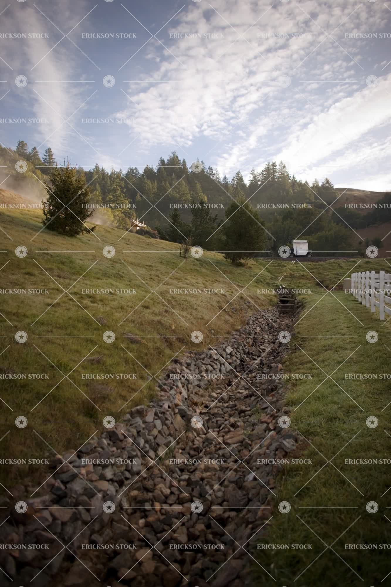 Rocks along the wall of a drain cutting through a grassy paddock on a farm in the country.