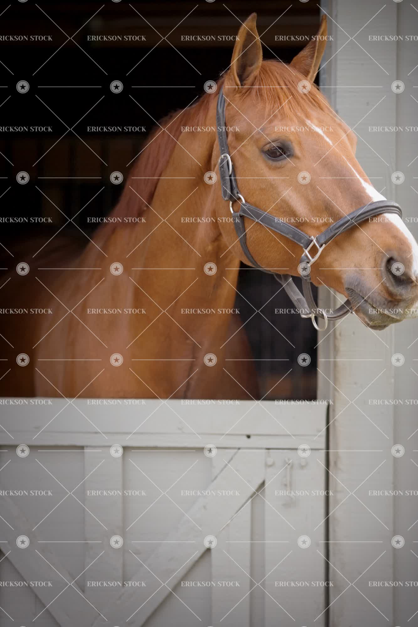 Portrait of a brown and white horse looking out of a stable door while wearing a bridle.
