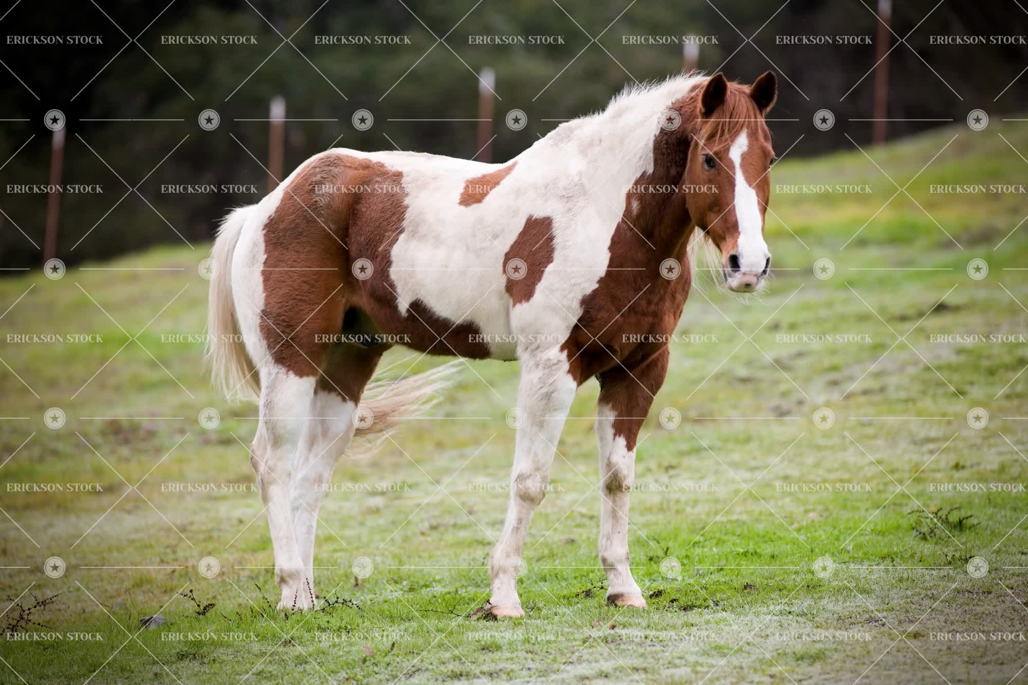 Tags animal, corral, countryside, day, field, fields, full body, full length, herbivore, herbivores, herbivorous, hoof, hooves, horizontal, horizontally, horizontals, horse, horses, looking at camera, Mammal, mammals, Meadow, meadows, nature, nobody, one animal, outdoor, outdoors, outside, pasture, pastures, piebald, rural, rural scene, rural scenes, Side view, side views, standing, stood, vertebrate, vertebrates, warm-blooded