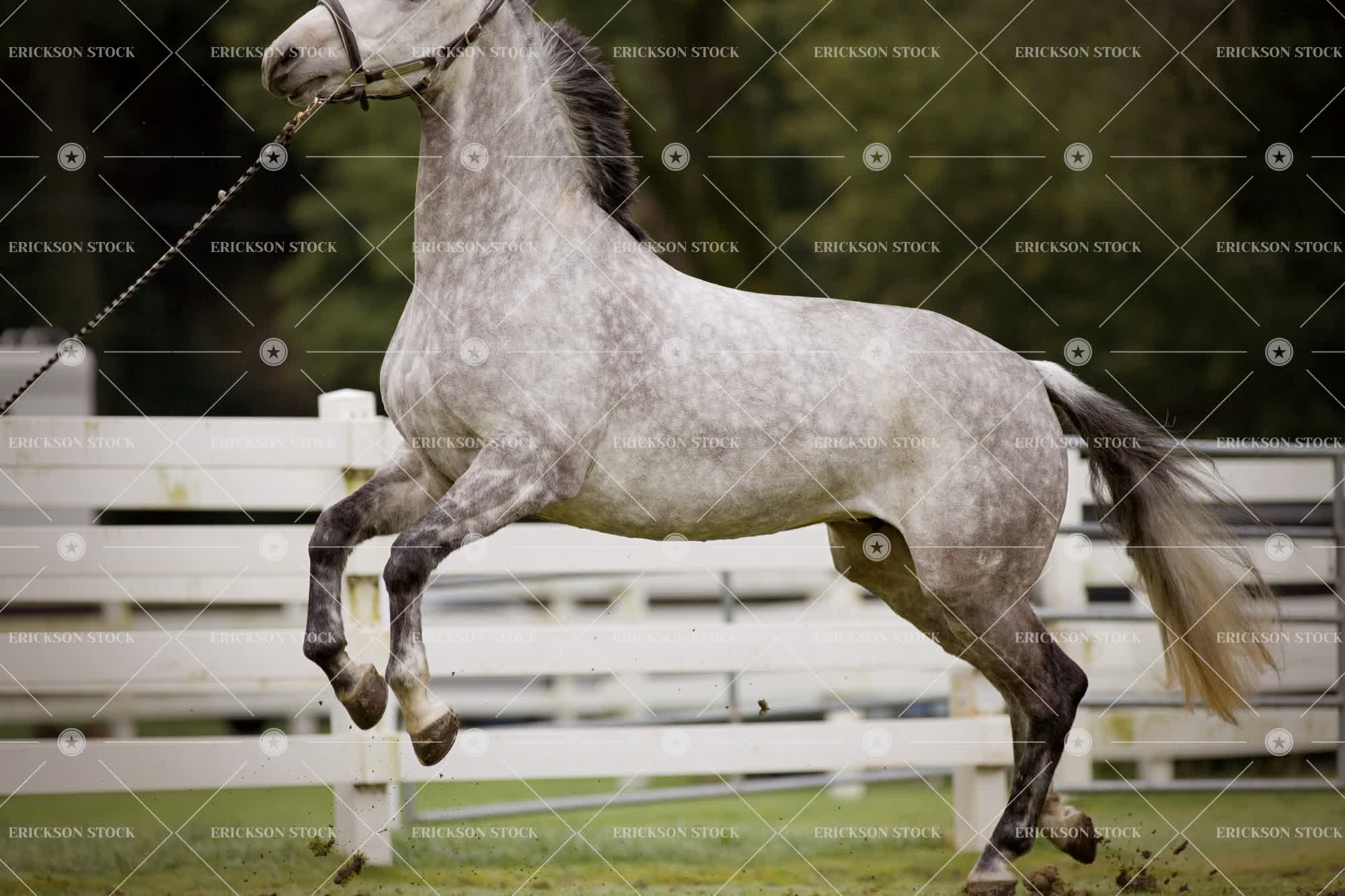 Grey horse galloping in a fenced paddock.