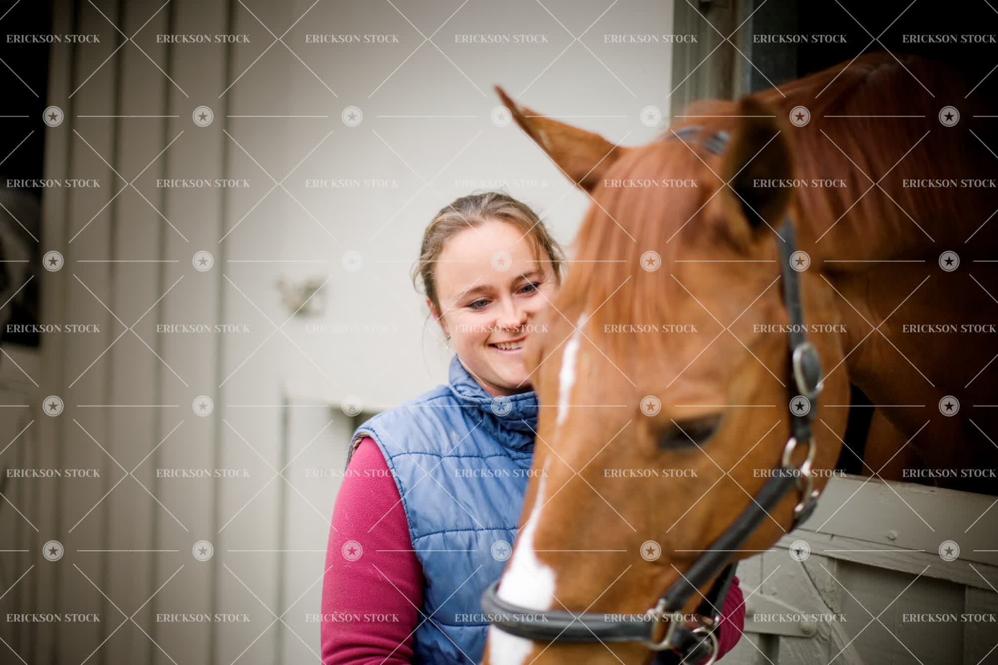Smiling young woman standing next to her brown horse who is sticking it’s head through the open door of a stable.