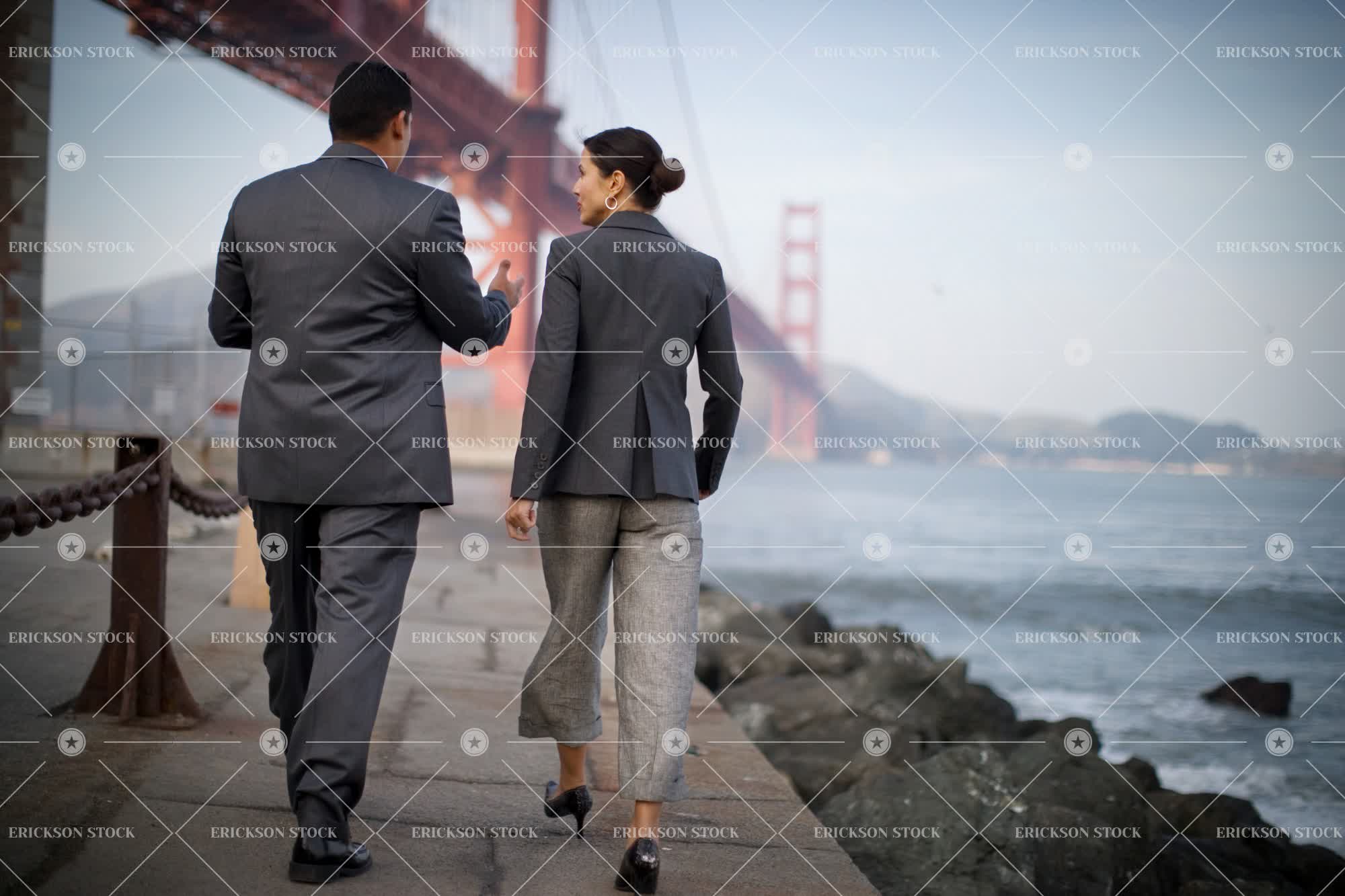 Businessman and businesswoman walking along the edge of a waterfront overlooking a harbor.