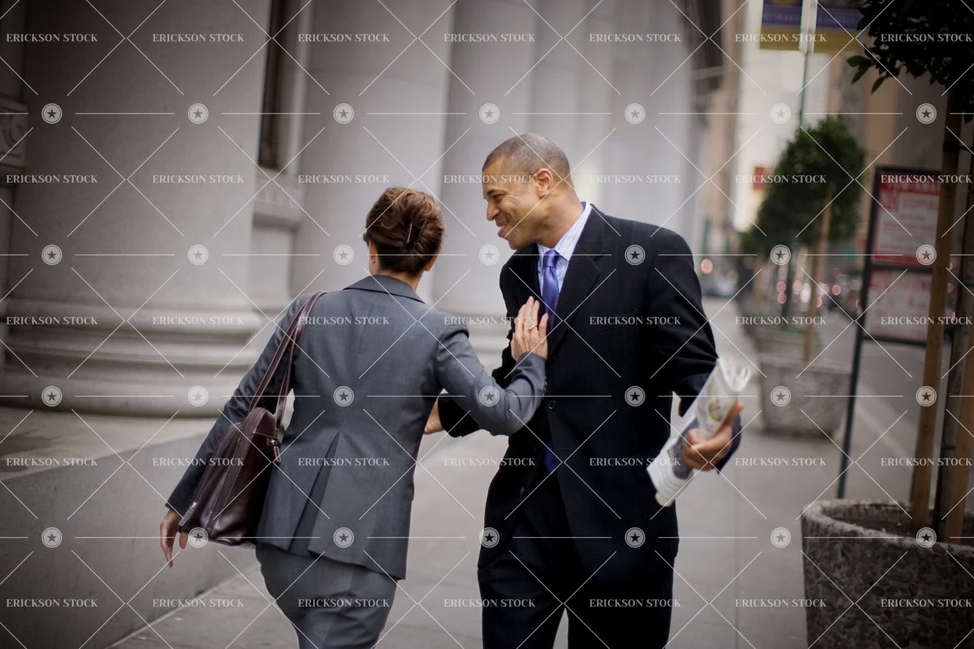 Mid-adult businessman laughing while being pushed aside by a female colleague on an inner city sidewalk.