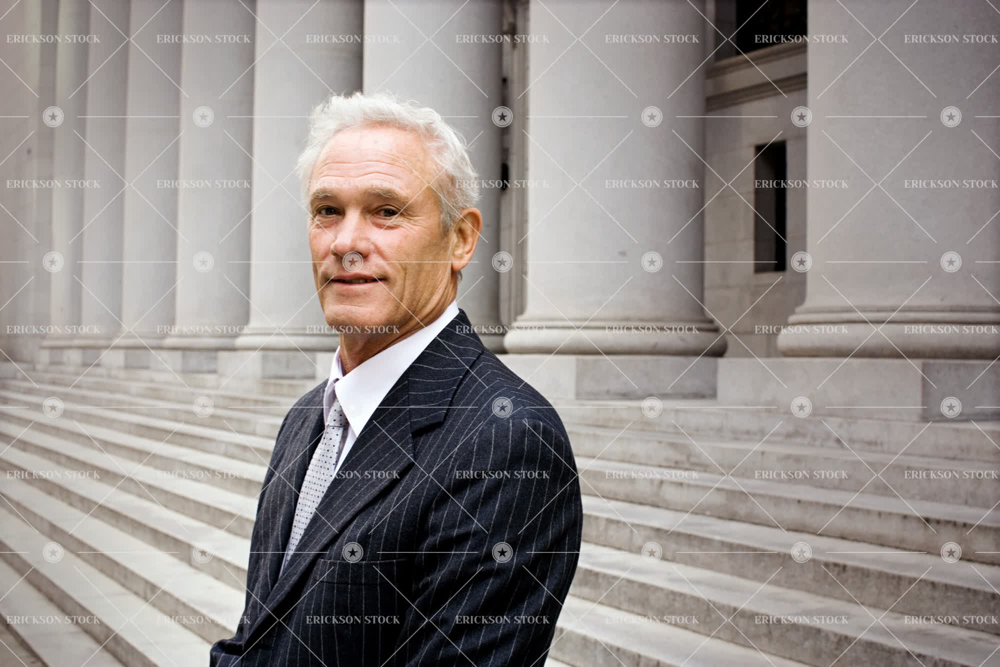 Portrait of a mature businessman standing outside on the steps of a large building.