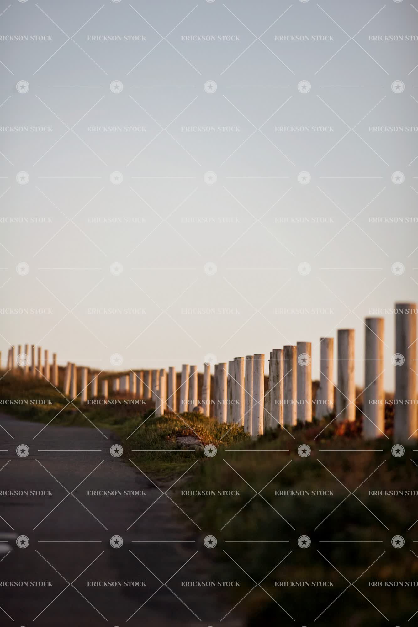 Wooden fence posts along a road near a beach at sunset.