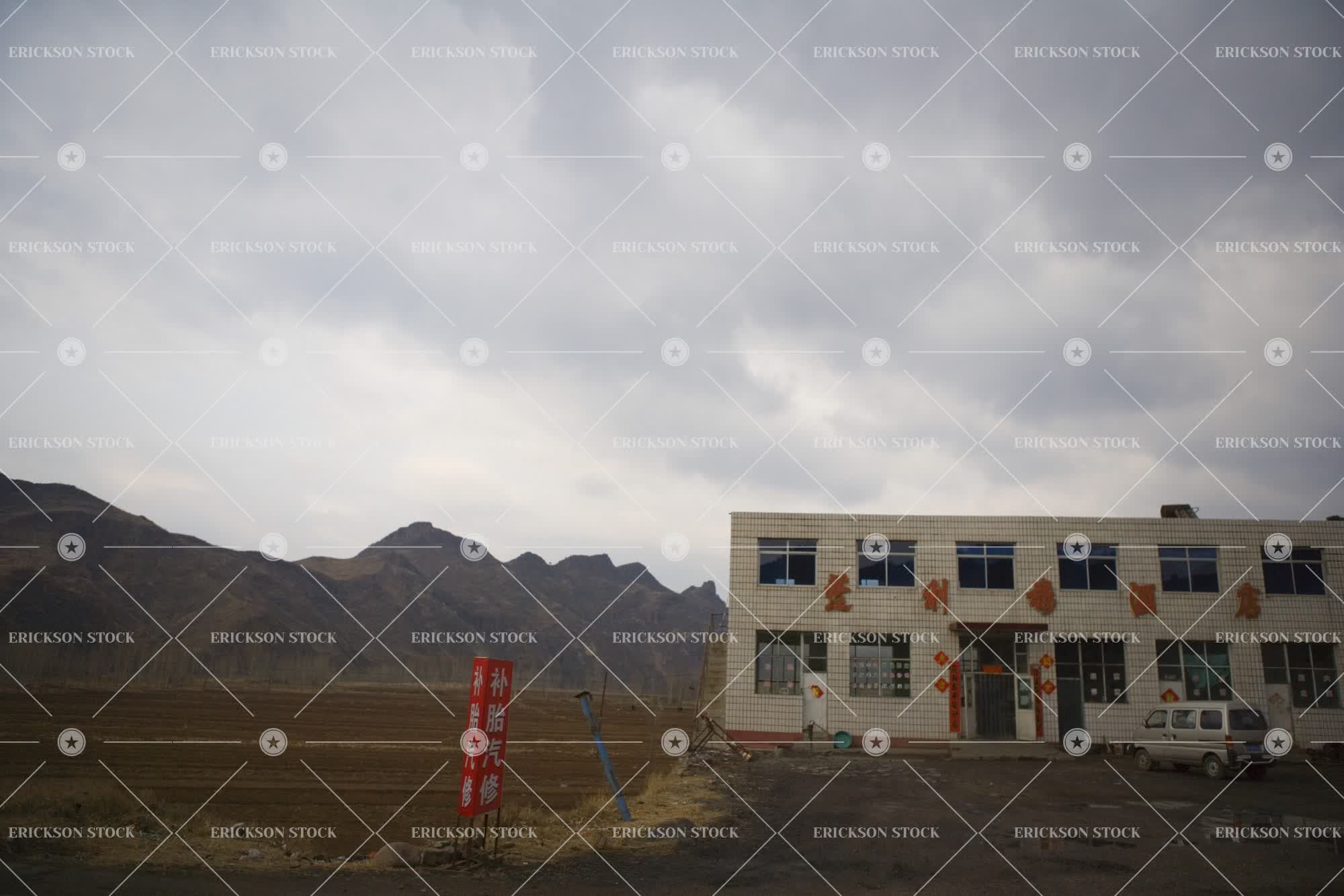 Building with Chinese signs next to an empty lot and rugged mountains.