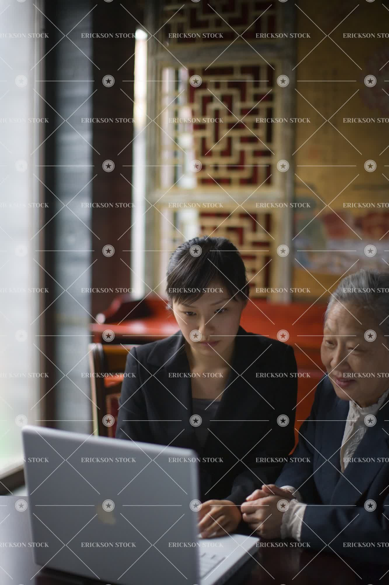 Senior woman and young woman using a laptop together at a Chinese cafe.