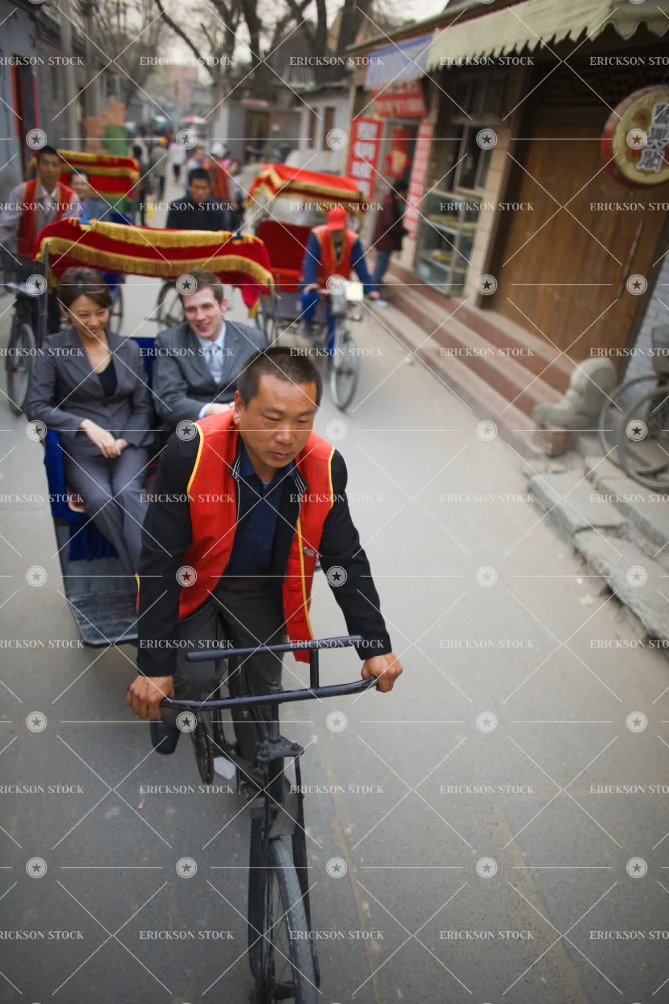 Businessman and woman getting a ride on a rickshaw through a narrow Chinese street.