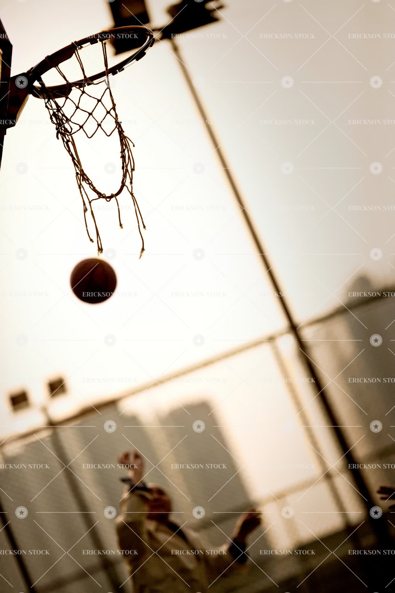 Basketball being thrown through a net at sunset.