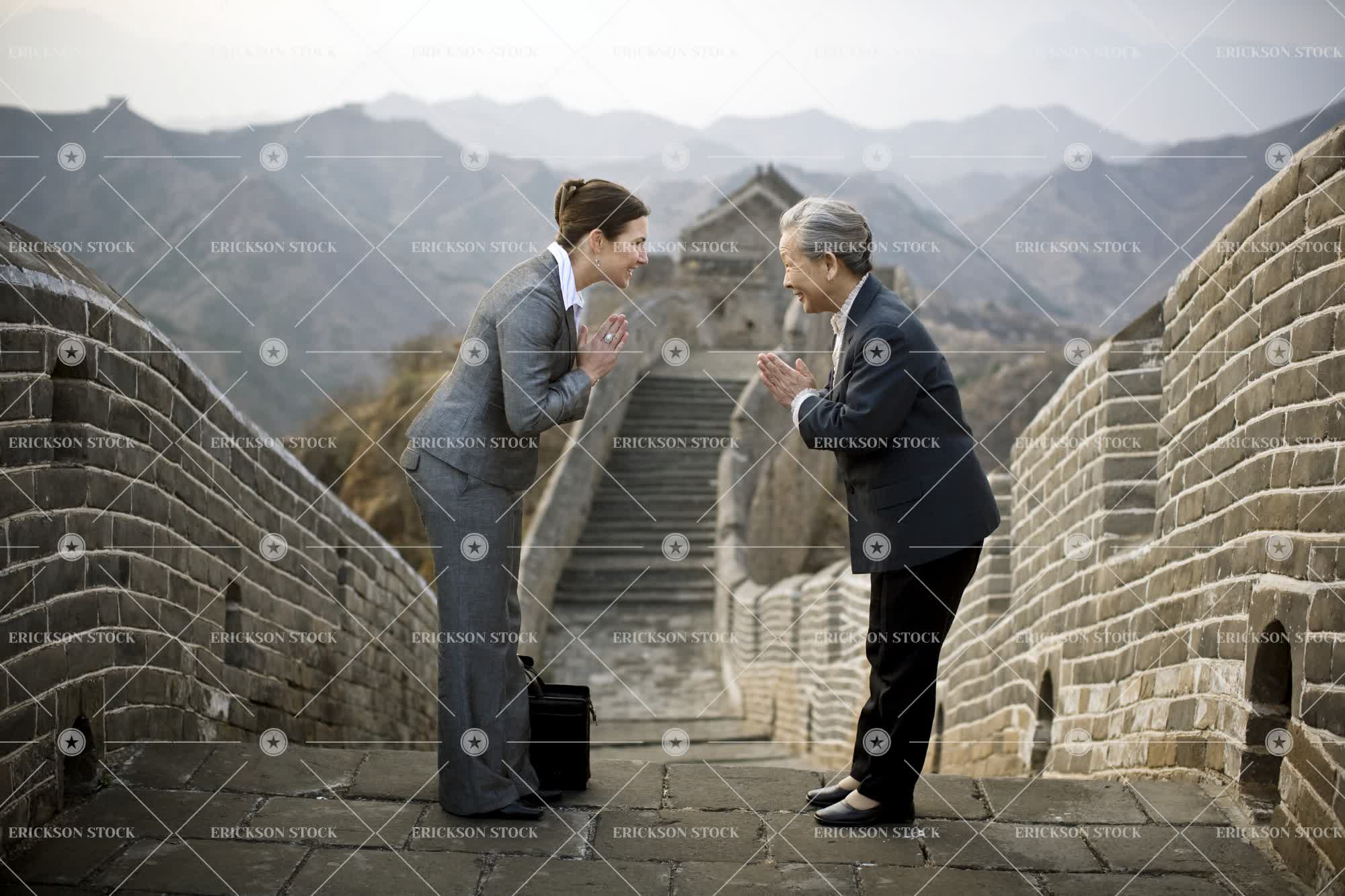 Mid-adult business woman and a senior female colleague greeting each other on the Great Wall of China.