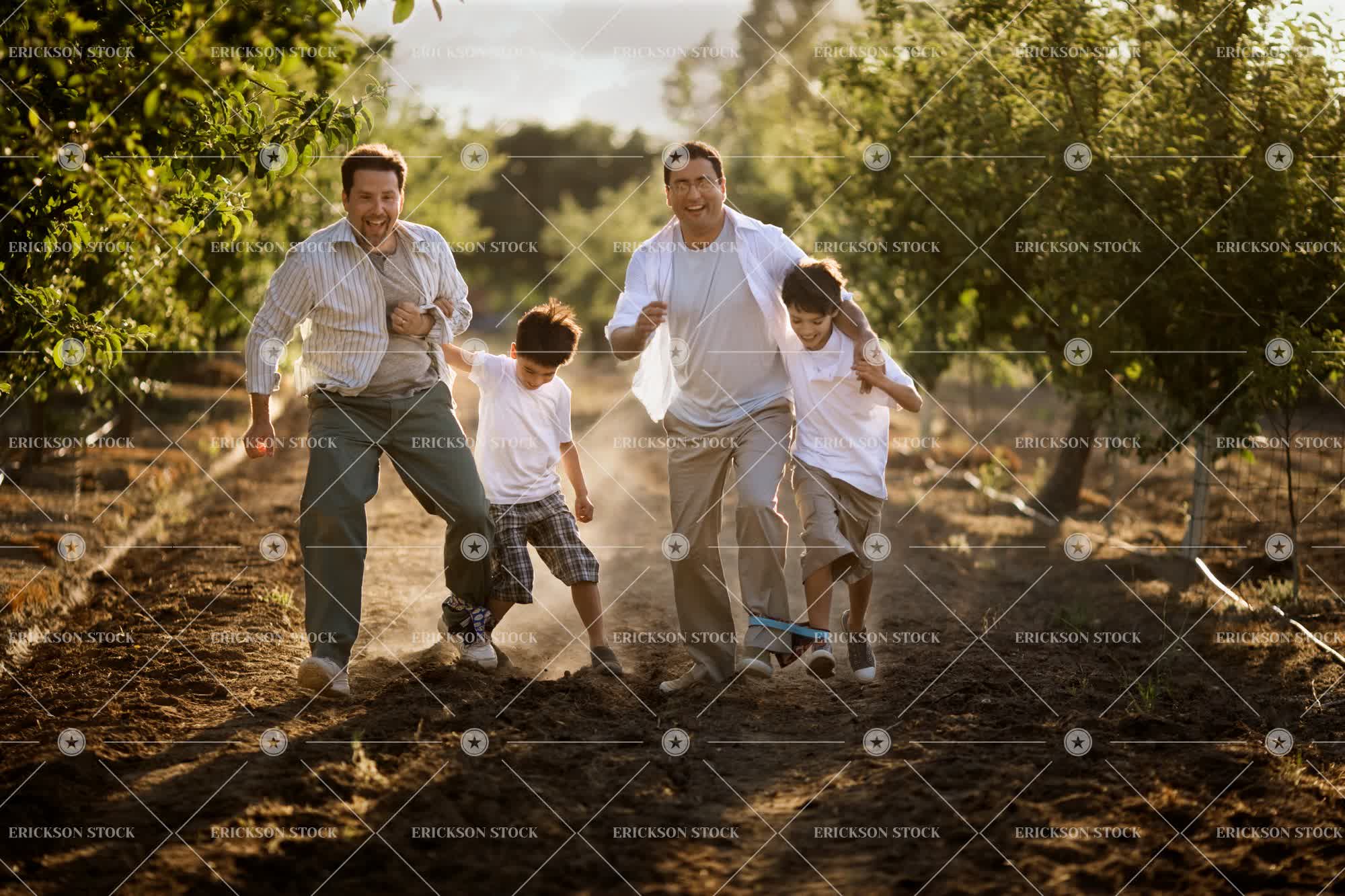 Two smiling mid-adult men walking in an orchard with their two young sons.