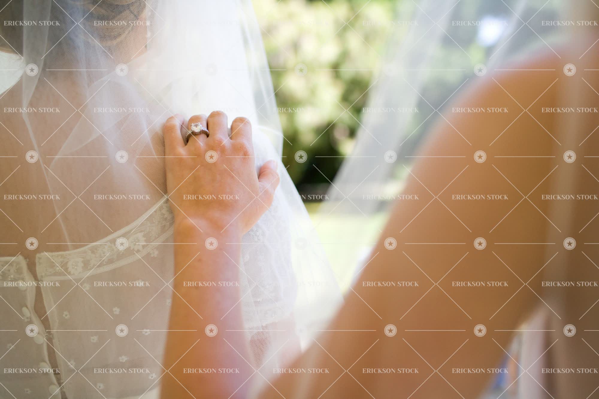 Tags adult, back, back view, bond, celebrate, commitment, cropped, day, dress, engagement ring, engagement rings, female, hand on shoulder, hands on shoulders, horizontal, mid adult, midsection, outdoor, outdoors, outside, part of, people, rear, rear view, ring, rings, selective focus, together, togetherness, two people, veil, veils, wedding, wedding dress, wedding dresses, wedding veil, wedding veils, woman, young adult