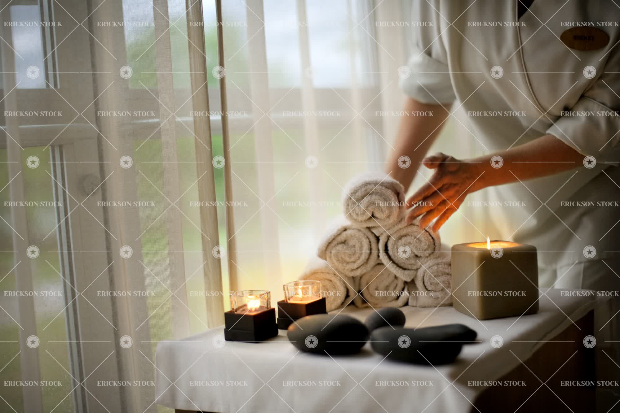 Hands of a young massage therapist at a health spa arranging the rolled-up towels in preparation for the next client.