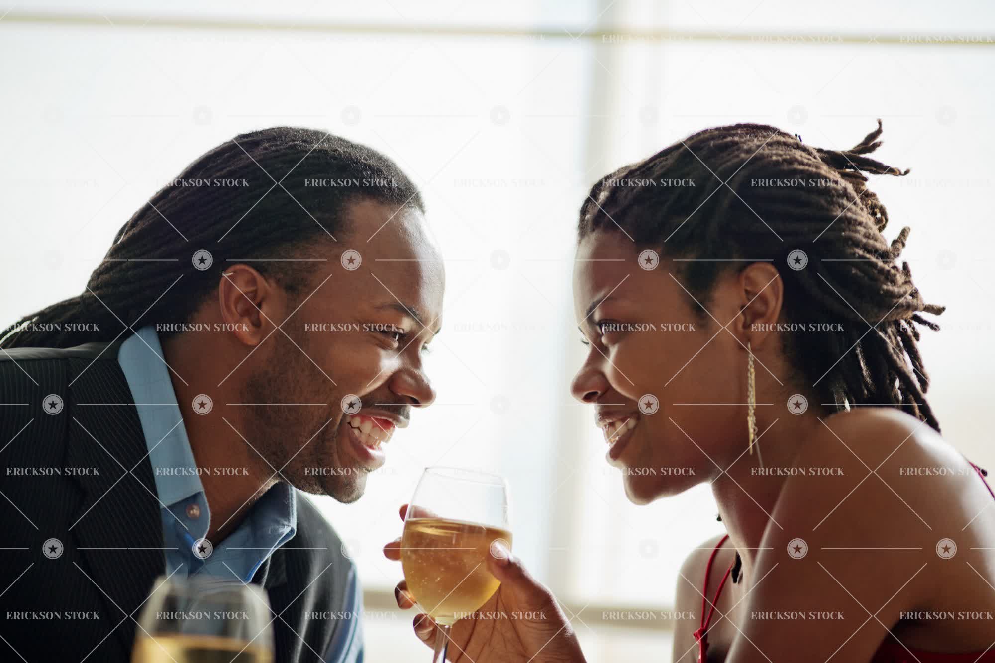 Tags adult, affectionate, african american, alcohol, black hair, boyfriend, braids, brunette, cheerful, couple, date, delight, dinner, dinner for two, drink, earring, earrings, enjoyment, face to face, facing each other, female, flirt, flirtatious, flirting, flirts, Food, Fun, girlfriend, girlfriends, hair braids, happiness, happy, having fun, head, head & shoulders, head and shoulders, head shot, headshot, heterosexual, heterosexual couple, heterosexual couples, hold, holding, holds, horizontal, indoor, indoors, inside, joy, joyful, leisure, leisure activities, leisure activity, looking at each other, love, loving, male, man, meal, mid adult, partner, people, person, recreation, recreational pursuit, recreational pursuits, relationship, relationships, romance, romantic, selective focus, shoulders, Side view, smile, smiling, suit, table, table for 2, table for two, Tables, together, togetherness, two people, well-dressed, white wine, wine, wine glass, wine glasses, wineglass, wineglasses, woman, young adult