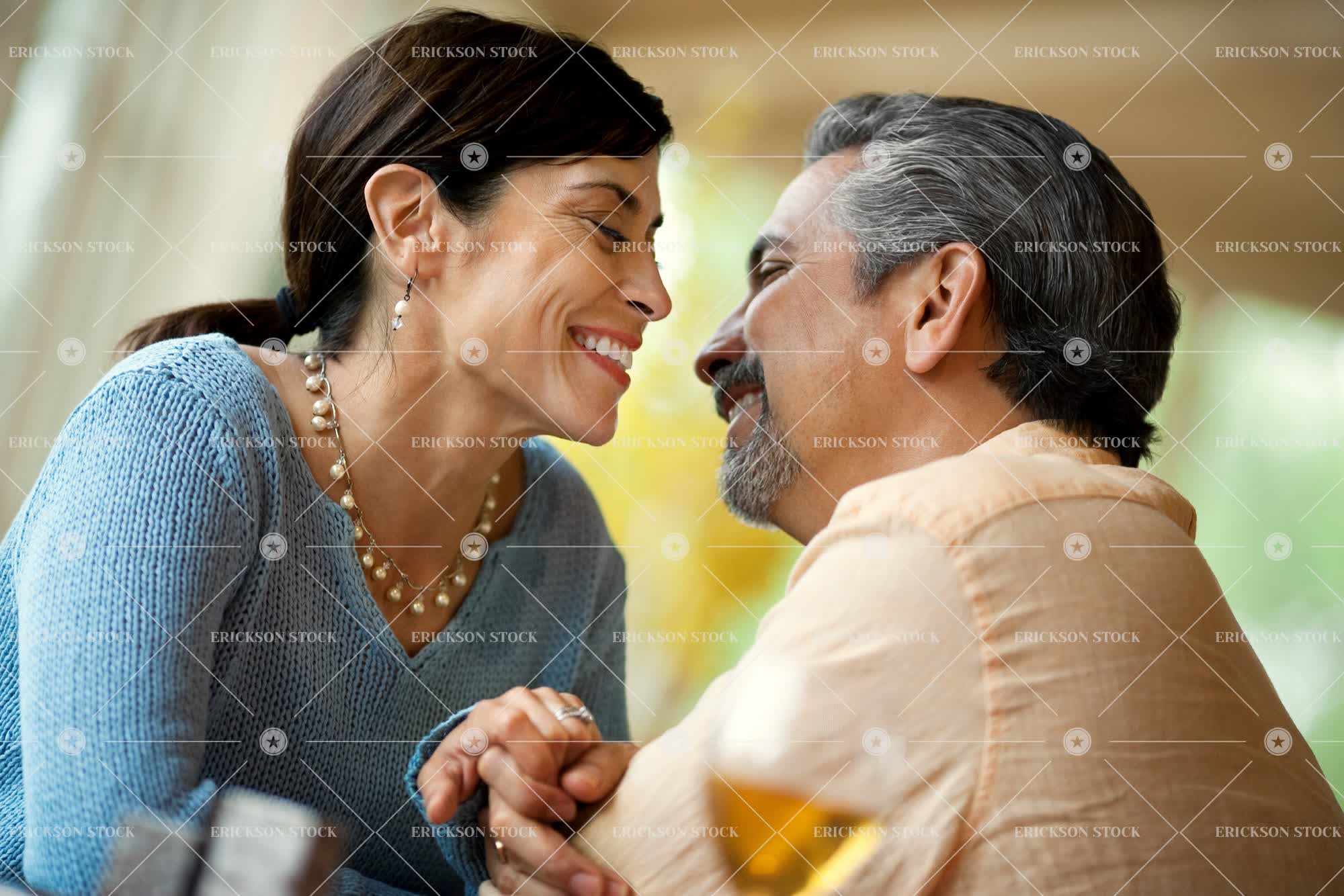 Happy mature couple smile and laugh as they enjoy a romantic lunch date together.