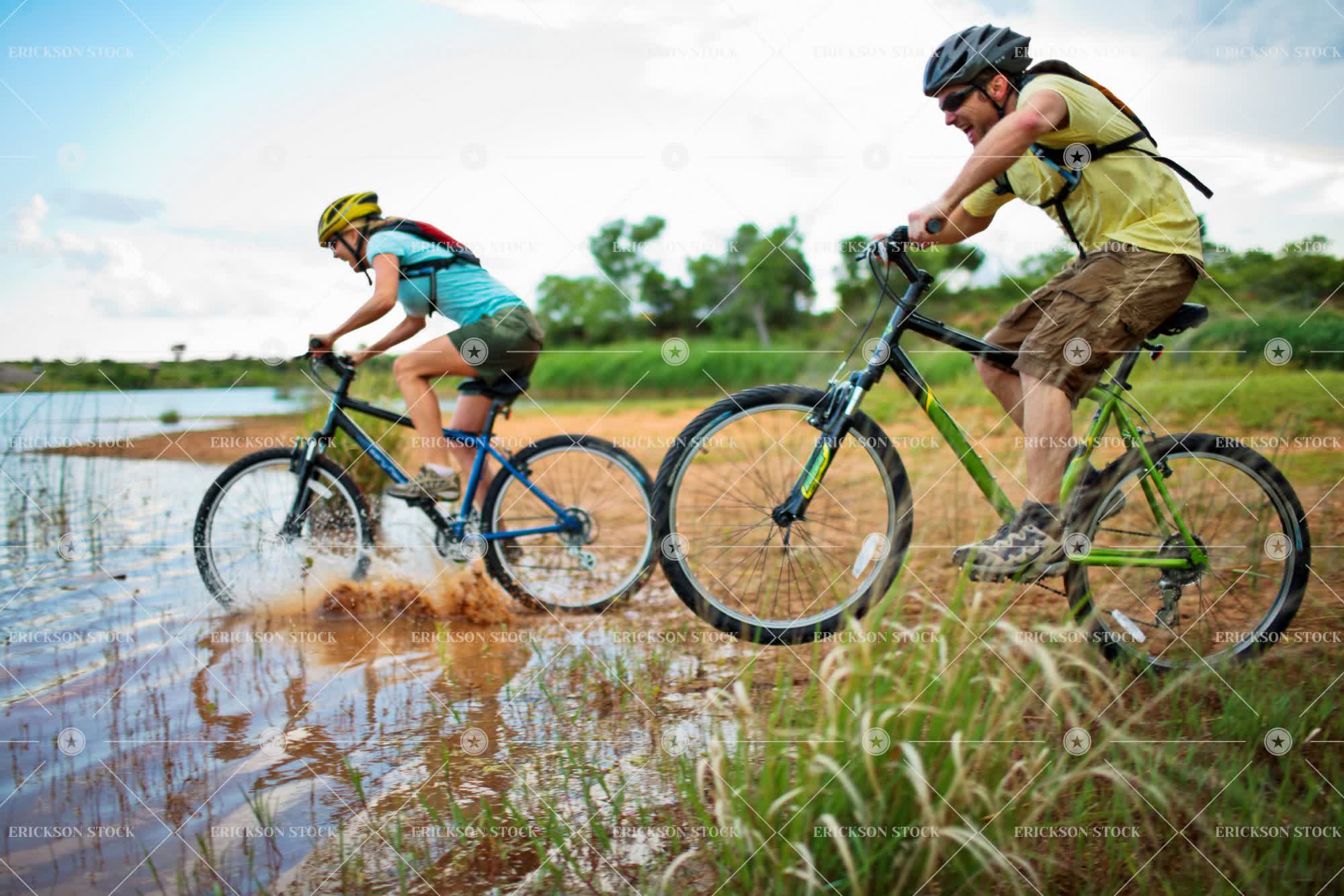 Adventurous young couple ride their bikes straight into the lake.
