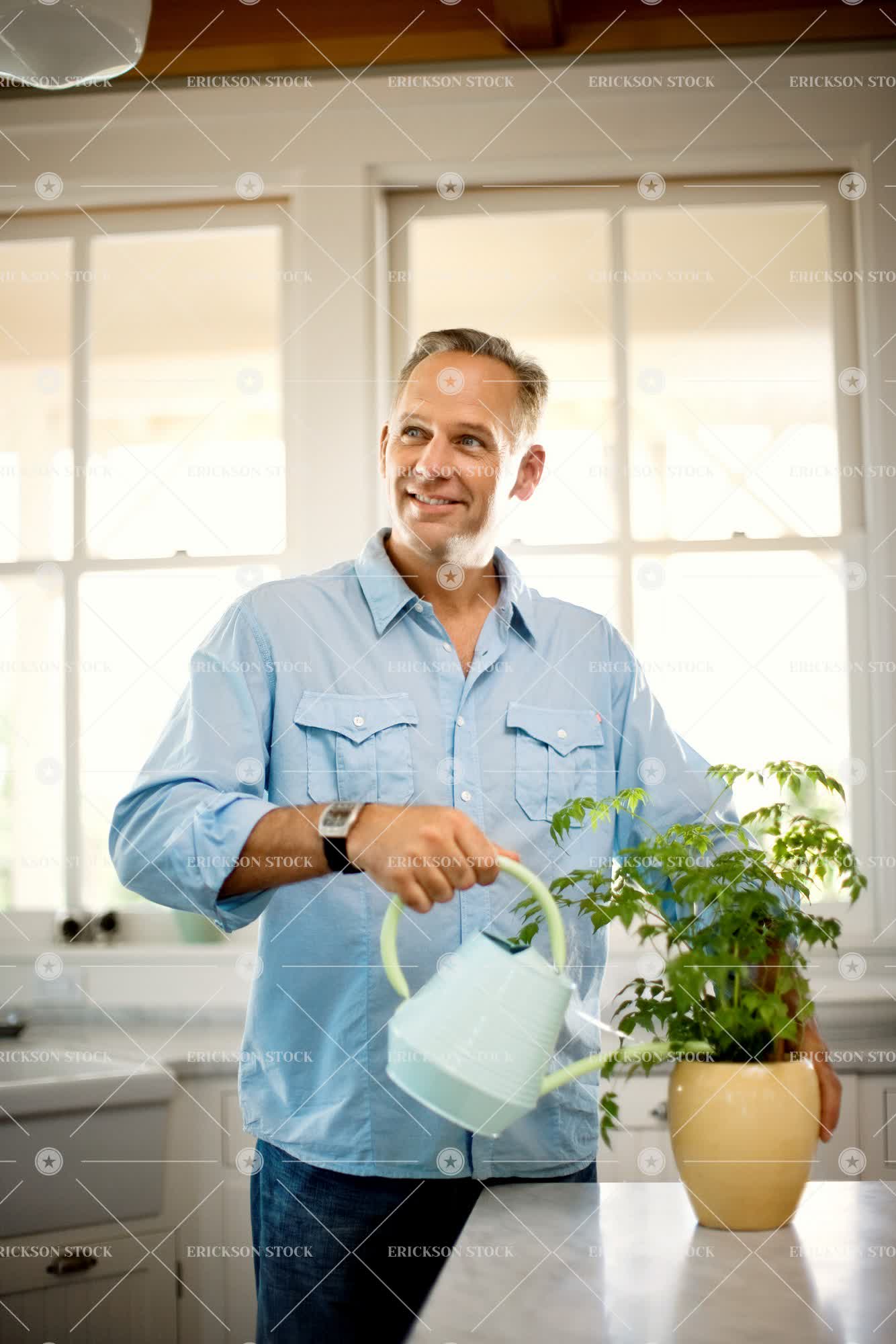 Tags adult, blond, button down shirt, casual clothes, caucasian, cheerful, collared shirt, counter, delight, domestic, enjoyment, happiness, happy, hold, holding, holds, home, home interior, home interiors, homes, indoor, indoors, inside, joy, joyful, Kitchen, kitchen counter, kitchen counters, Kitchens, leisure, leisure activities, leisure activity, male, man, mature adult, mid adult, one person, people, person, pot plant, pot plants, potted plant, potted plants, recreation, recreational pursuit, recreational pursuits, selective focus, shirt, shirts, smile, smiling, sprinkling can, sprinkling cans, standing, three quarter length, towhead, vertical, water cans, watering can, young adult