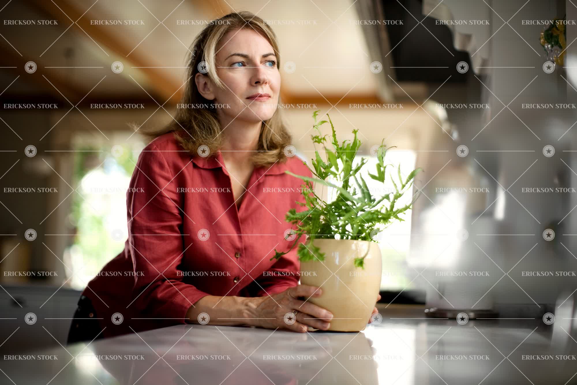 Tags adult, blond, casual clothes, caucasian, contemplate, counter, domestic, female, half length, hold, holding, holds, home, home interior, home interiors, homes, horizontal, indoor, indoors, inside, Kitchen, kitchen counter, kitchen counters, Kitchens, leisure, leisure activities, leisure activity, mature adult, mid adult, one person, pensive, people, person, pot plant, pot plants, potted plant, potted plants, recreation, recreational pursuit, recreational pursuits, selective focus, thinking, thoughtful, towhead, waist up, woman, young adult