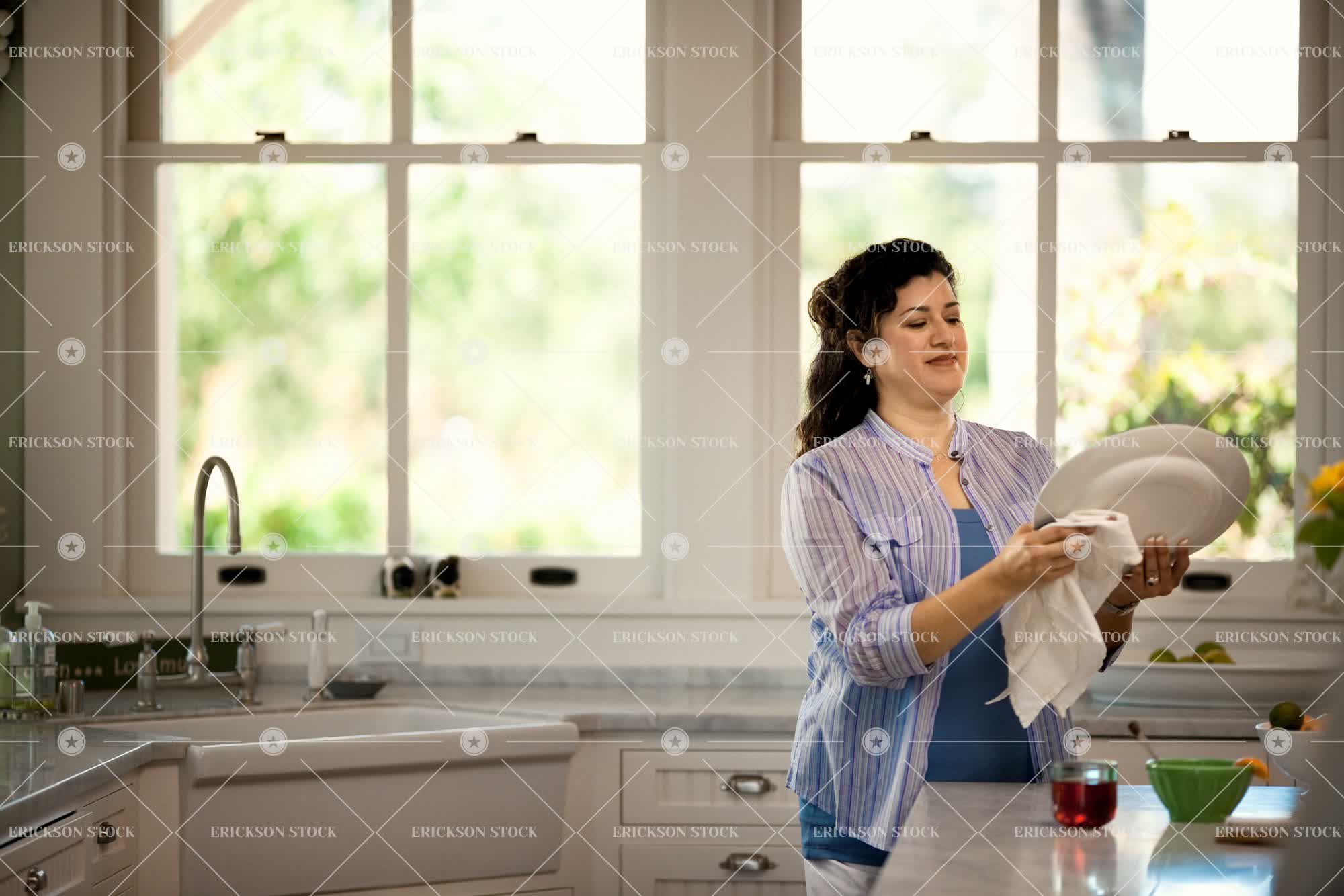 Woman drying a plate in a light and airy kitchen.