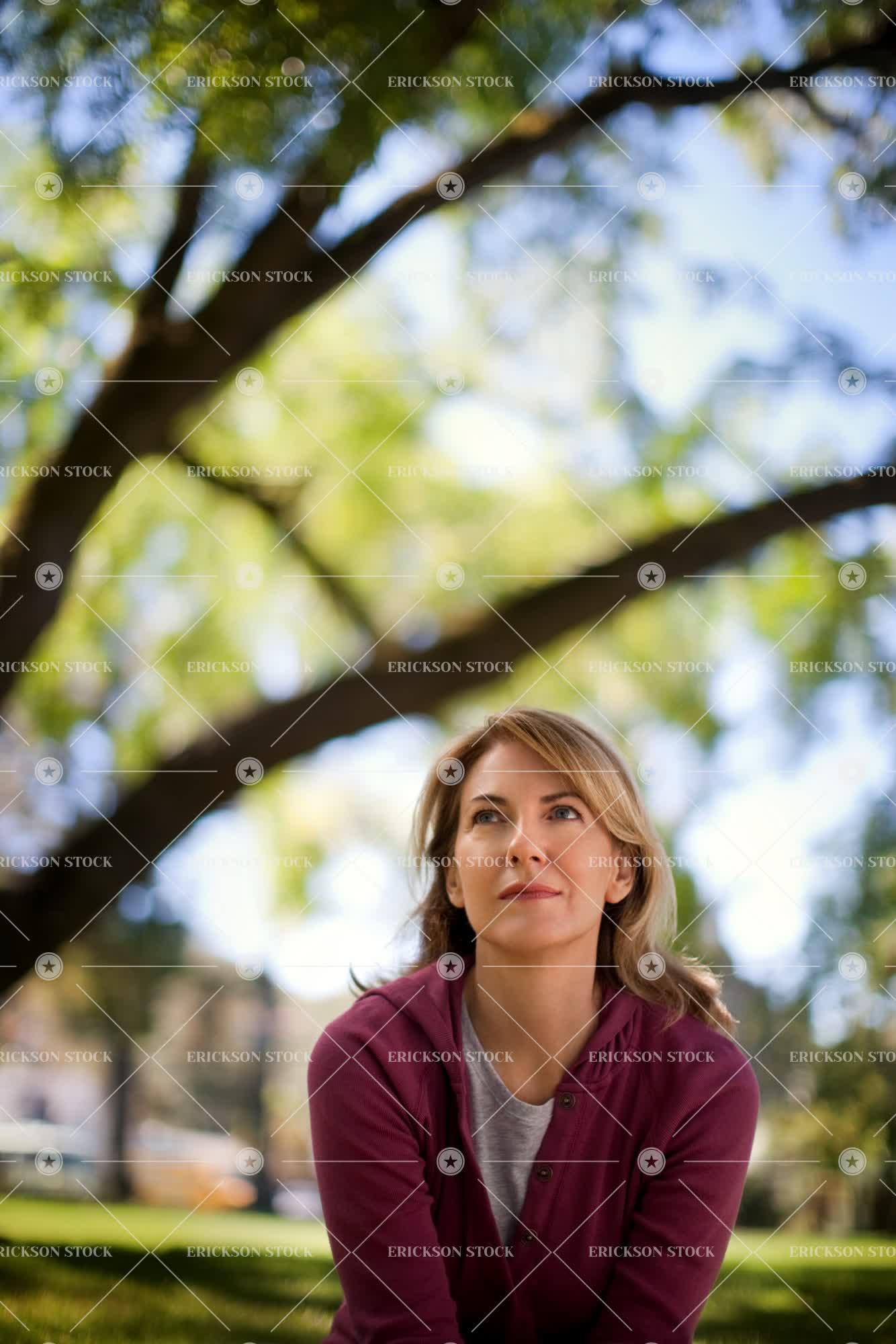Tags adult, blond, casual clothes, caucasian, contemplate, content, day, female, garden, gardens, half length, leisure, leisure activities, leisure activity, look up, looking up, mature adult, mid adult, one person, outdoor, outdoors, outside, Park, parks, pensive, people, person, pleased, public park, public parks, public space, public spaces, recreation, recreational pursuit, recreational pursuits, selective focus, sit, sitting, thinking, thoughtful, towhead, vertical, waist up, woman