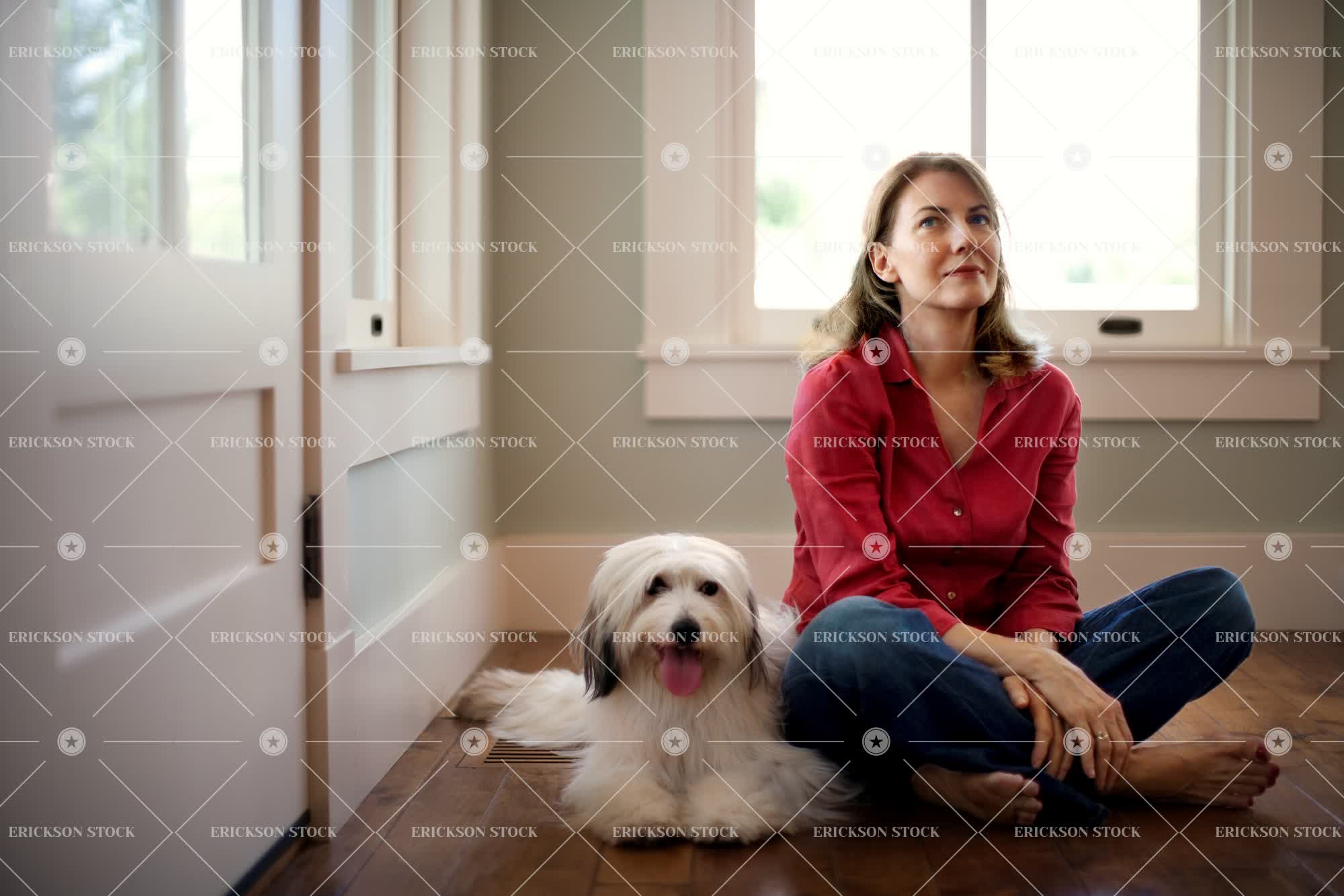 Middle-aged woman looks pensive as she sits on the floor beside her dog.