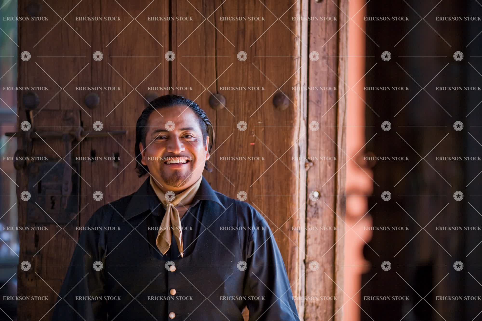Tags adult, cheerful, copy space, copy space right, day, door, doorway, entrance, entry, entryway, entryways, Eye contact, frame, gaucho, gaucho costume, grin, grinning, half length, happiness, happy, horizontal, indoor, indoors, inside, latin american, look at camera, looking at camera, mature adult, mid adult, negative space, negative space right, one person, people, person, portrait, Portraits, selective focus, smile, smiles, smiling, subject left, traditional clothes, traditional clothing, uniform, uniforms, waist up, young adult