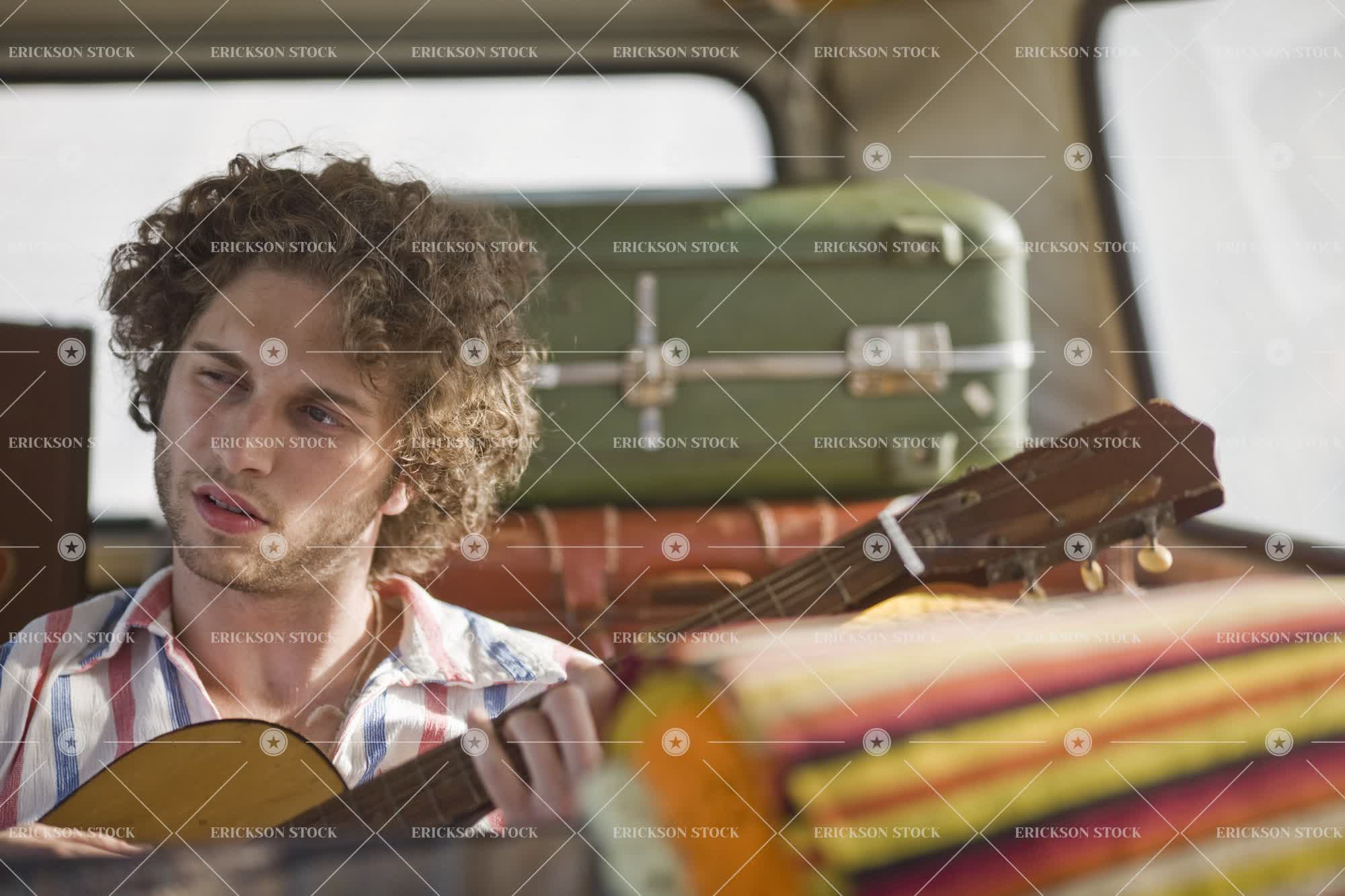 Young man playing a guitar inside a van.