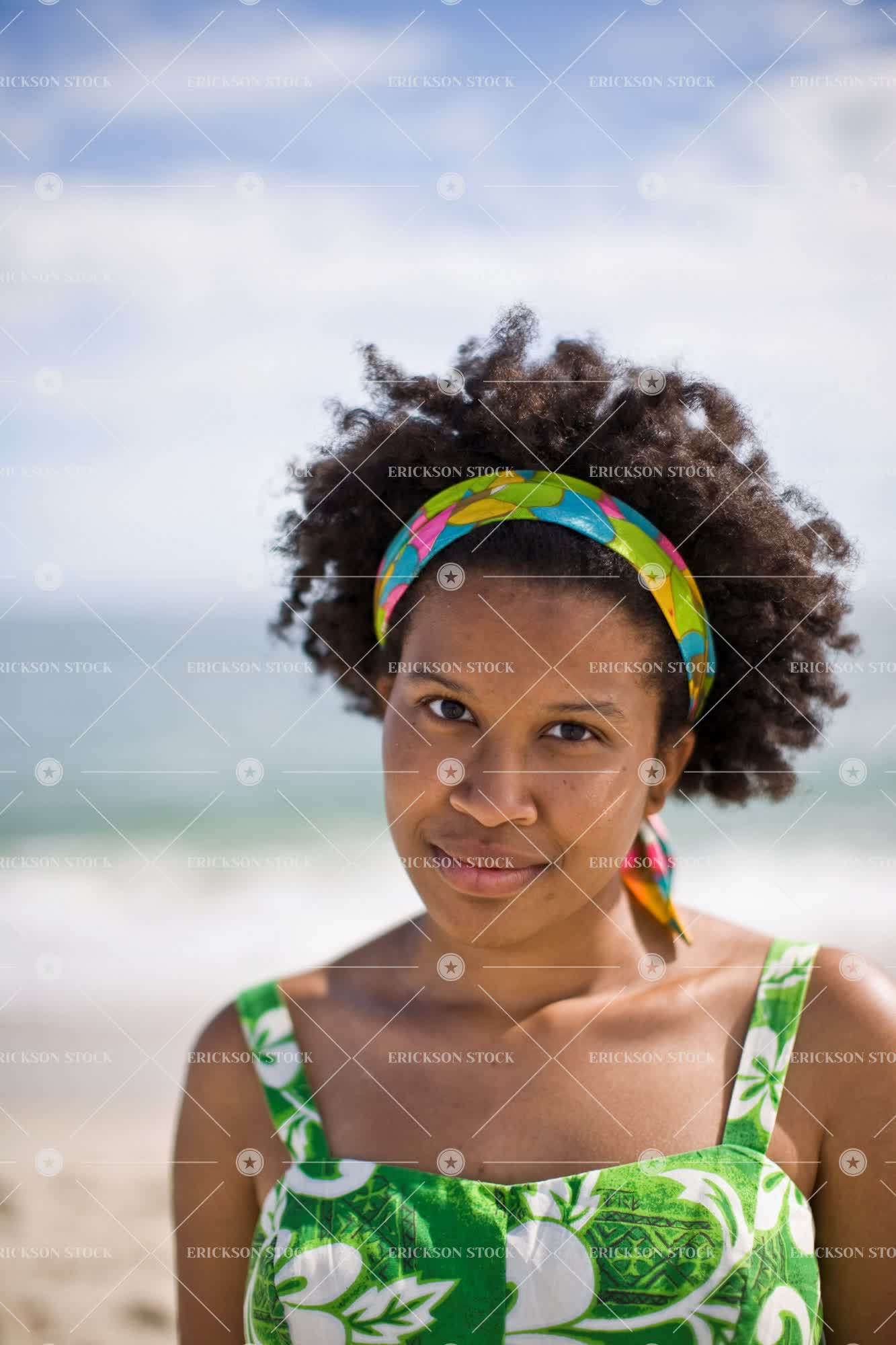 Tags adult, african american, bathing suit, beach, coast, curl, day, Eye contact, female, headband, headbands, look at camera, looking at camera, one person, one piece, outdoor, outdoors, outside, portrait, Portraits, recreation, recreational pursuit, recreational pursuits, ringlet, ringlets, seaside, selective focus, swimsuit, swimwear, vertical, woman, young adult