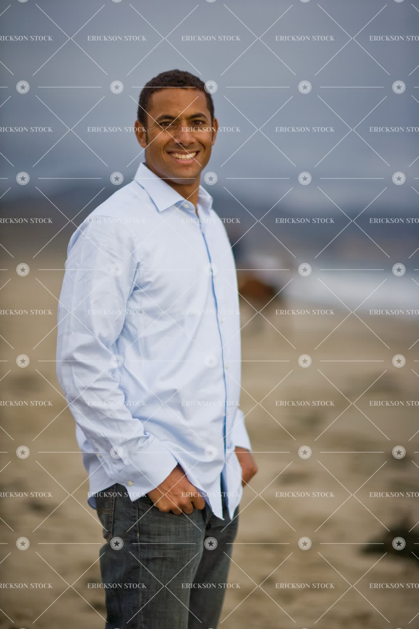 Tags adult, beach, casual clothes, cheerful, day, Eye contact, grin, grinning, happiness, happy, look at camera, looking at camera, male, man, mid adult, middle eastern, one person, outdoor, outdoors, outside, people, person, seaside, seasides, selective focus, shoreline, shorelines, smile, smiles, smiling, stand, standing, three quarter length, vertical, water, young adult