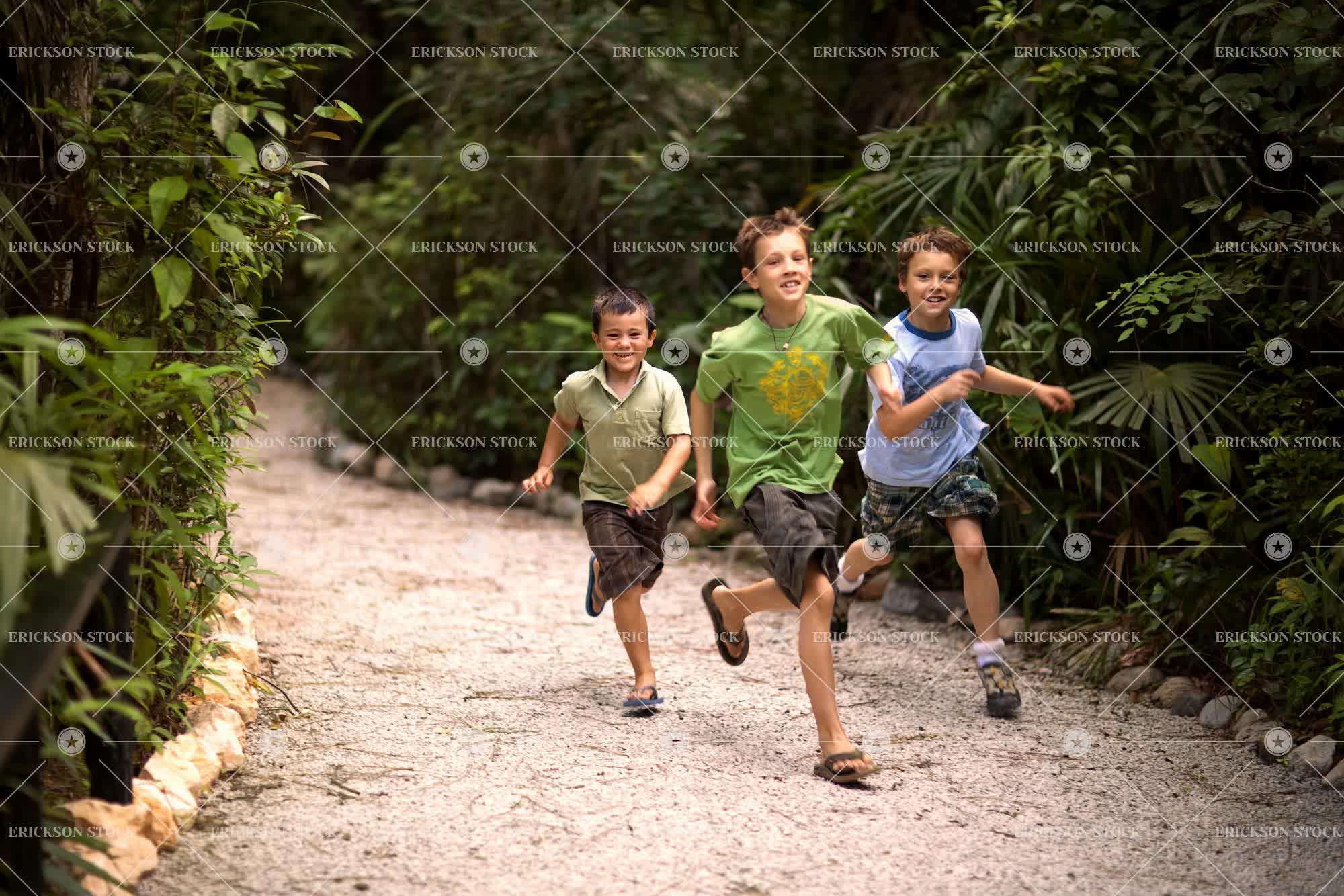 Three smiling boys having fun running along a path winding through a nature reserve.