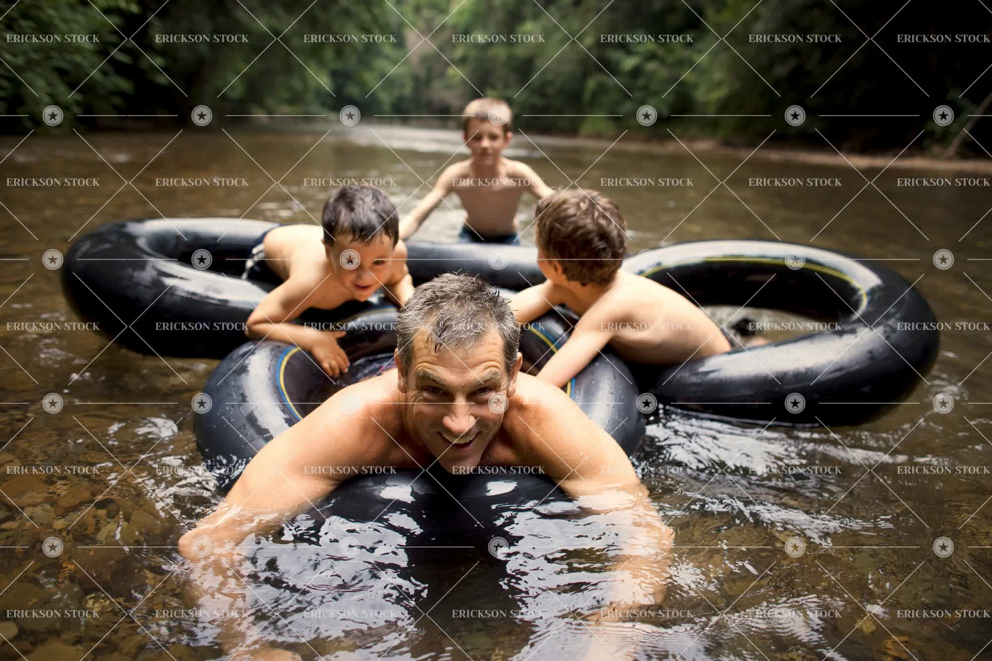 Portrait of mid adult man and his sons floating on inflatable rings during an outdoor adventure.