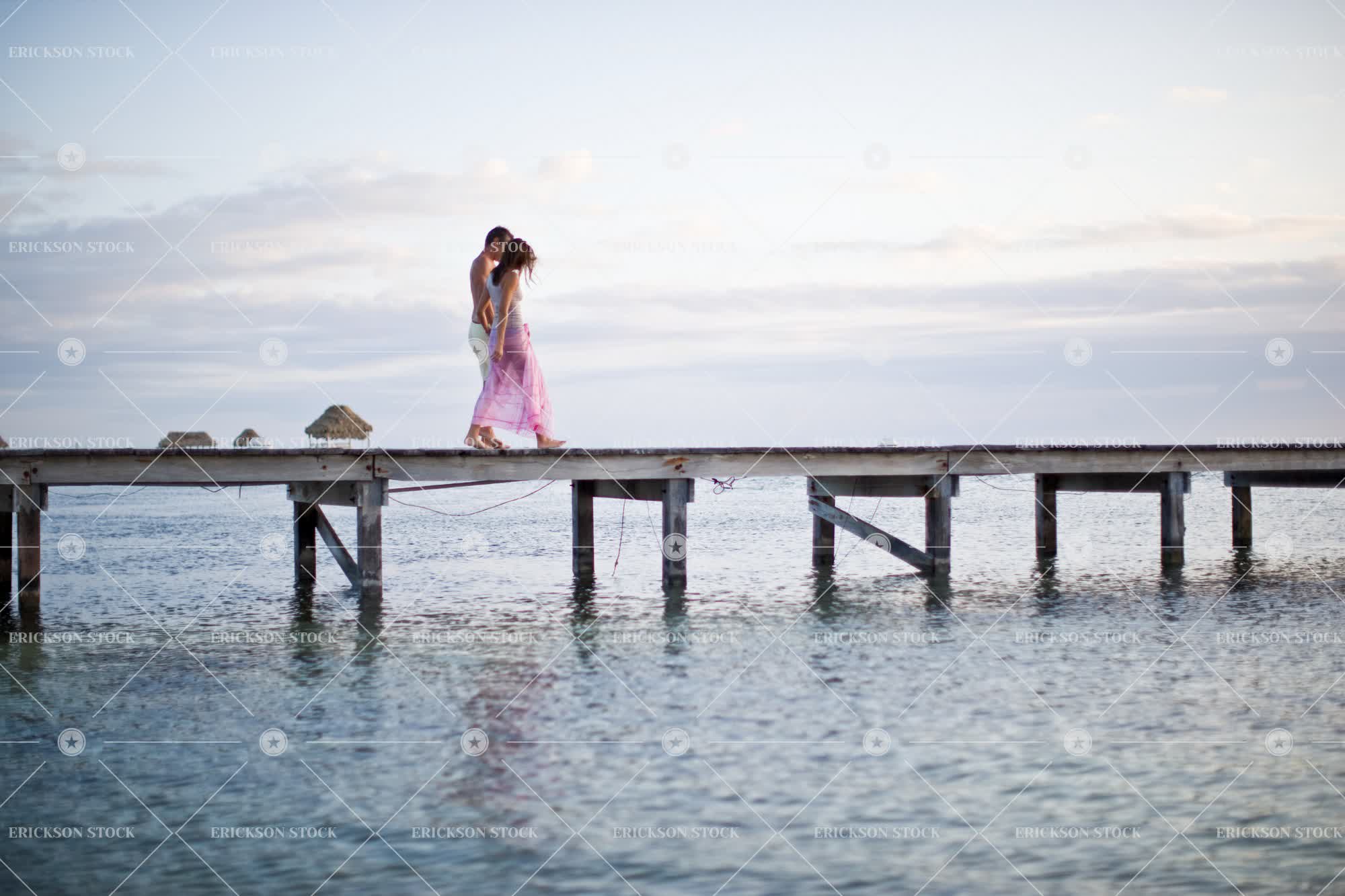Couple walking along a jetty over water.