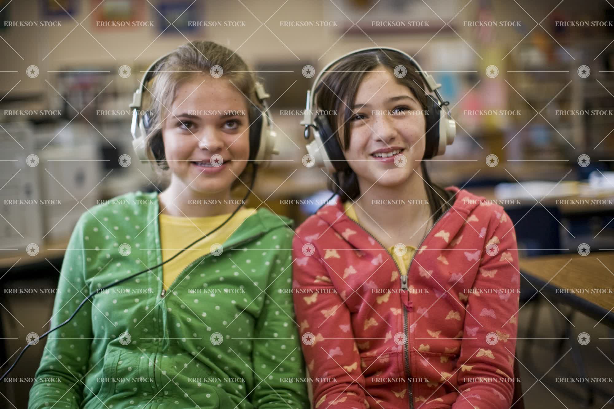 Tags casual clothes, caucasian, cheerful, child, class, companion, day, female, focus on foreground, friend, friends, friendship, front view, girl, girls, grin, grinning, half length, happiness, happy, headphones, headset, horizontal, indoor, indoors, inside, keyword, kid, kids, libraries, library, listen, listened, listening, listens, people, portrait, Portraits, pre-adolescent, pre-adolescents, Pre-teen, pre-teens, preteen, preteens, School, schools, sit, sitting, smile, smiles, smiling, teenage girl, teenager, together, togetherness, tween, two people, waist up, Watch, watching