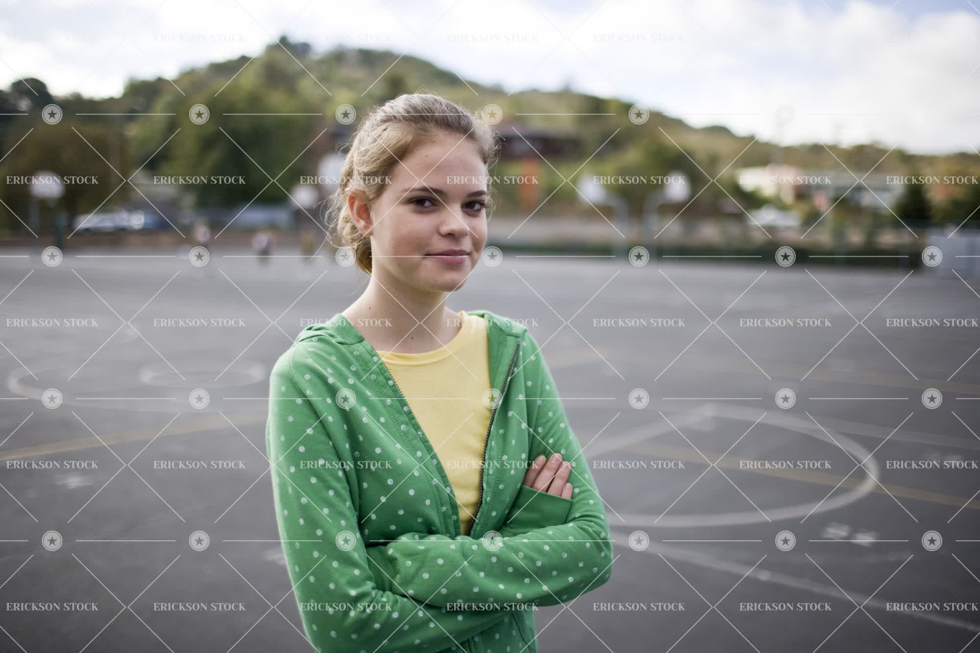 Tags arms crossed, calm, casual clothes, caucasian, copy space, copy space right, day, female, folded arms, front view, girl, girls, half length, horizontal, keyword, negative space, negative space right, one person, outdoor, outdoors, outside, people, person, portrait, Portraits, school yard, school yards, serious, seriously, stand, standing, stern, student, students, subject left, teenage girl, teenager, waist up, young adult